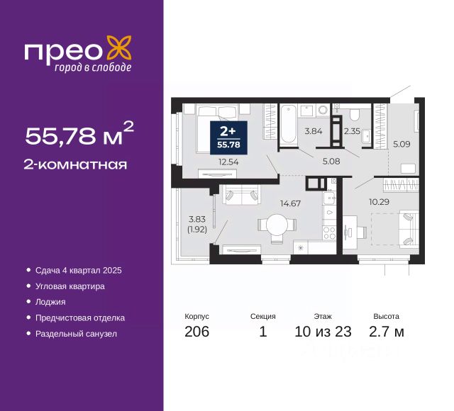 Двухкомнатная квартира с предчистовой отделкой в ЖК "Прео" на 8 этаже. Общая площадь: 64.38 кв.м., жилая: 29.31 кв.м., площадь просторной кухни-столовой: 16.28 кв.м. Квартира - распашонка, без проходных комнат, окна выходят на paзные стороны дома. В квартире одна лоджия, один совмещенный и один раздельный санузел. Высота потолков 2.7 м.