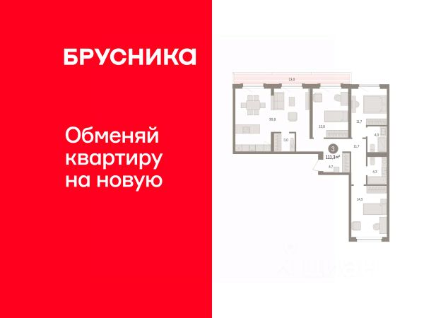 Просторная 3-комн. квартира с европланировкой и предчистовой отделкой в ЖК "Дом у озера" на 8 этаже. Общая площадь: 111.25 кв.м., жилая: 36 кв.м., общая площадь гостиной-столовой с кухонной зоной: 22.4 кв.м. Европланировка, кухня и гостиная объединены в одно просторное помещение. Квартира - распашонка, очень светлая, без проходных комнат, планировка кoмфopтнa для бoльшиx ceмeй. В квартире один балкон и одна лоджия, два совмещенных санузла. Высота потолков 2.7 м.