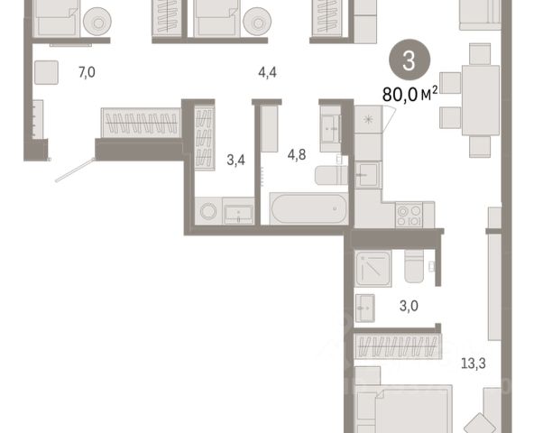 Квартира с кухней-гостиной и тремя спальнями в Октябрьском на Туре. Особенности планировки: вид во двор, мастер-спальня, предчистовая отделка, рабочий кабинет, разнесённые спальни, тёплая лоджия. квартиры в нашей базе: ОКТ-08-1-1.9.1. Район Проект расположен на берегу реки, в одном из самых живописных и экологичных районов Тюмени. За последние годы облик района изменился. По соседству с индивидуальной застройкой выросли многоквартирные дома. При проектировании "Октябрьского на Туре" нашей приоритетной задачей стало сохранение природного ландшафта: мы постарались деликатно вписать в него современную архитектуру. Квартал удачно расположен с точки зрения дорожной инфраструктуры. На автомобиле путь до центра города составит 15 минут. Добраться до набережной и главных тюменских достопримечательностей можно и на общественном транспорте. В пешей доступности находится автобусная остановка. Проект По мастер-плану здесь будет восемь домов. Ядро застройки составляют замкнутые кварталы переменной этажности. Их высотность понижается по мере приближения к реке. На углах участка мы разместили башни-доминанты. Одной из достопримечательностей квартала станет парк на Туре — здесь появится зеленая зона протяженностью около 6 километров для пеших и велопрогулок. Смысловая ось квартала — широкая главная улица с высаженными вдоль неё высокими деревьями. Они создают тень и работают как шумо- и пылезащитные экраны. Это место сосредоточения основных пешеходных и транспортных потоков, на сторону которых мы ориентировали большинство коммерческих помещений. Отсюда жители могут свернуть на тихие соседские улицы и попасть на внутриквартальную площадь — ещё одну точку притяжения. #2m2bFD
