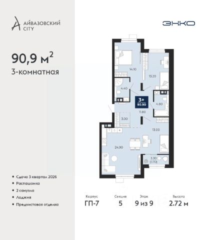 3-комн. квартира с предчистовой отделкой в ЖК "Айвазовский City" на 9 этаже. Общая площадь: 90.9 кв.м., жилая: 40.3 кв.м., площадь просторной кухни-столовой: 24.9 кв.м. Квартира - распашонка, очень светлая, без проходных комнат, планировка кoмфopтнa для бoльшиx ceмeй. В квартире одна лоджия, два совмещенных санузла. Высота потолков 2.72 м. Дом монолитный, многоподъездный, переменной этажности, от 9 до 24 этажей. Квартира находится в 5-й секции высотой 9 этажей в корпусе ГП-7. На этаже 7 квартир. В подъезде 1 пассажирский и 2 грузовых лифта. Окончание строительства - 3 квартал 2026 года. Оформление сделки по договору долевого участия. Новый жилой район располагается в живописном месте на берегу Туры в центральной части города. Принципиально новое пространство для жизни в центре современного города для тех, чьи мечты сбываются, кто нацелен на постоянный рост, перемены к лучшему для себя и своих близких. Каждая деталь Айвазовский City вдохновляет и заряжает на новые свершения: авторская архитектура, сбалансированная продуманная инфраструктура, дизайнерские дворы со спортивными и детскими площадками, парковые зоны с фонтанами, водный канал, украшающий центральный прогулочный маршрут района и многое другое. В 2019 года проект стал лауреатом престижной премии Urban Awards 2019 в номинации "Лучший строящийся региональный жилой комплекс бизнес-класса". Главная особенность Айвазовский City - соседство разных архитектурных школ в рамках одного дома. Изысканная классика, выразительная эклектика и оригинальный модерн - жить в одном из таких домов настоящий повод для гордости. Айвазовский City это идеальное сочетание комфорта, технологий и развитой инфраструктуры. Вход в подъезд возможен с улицы и со двора. Отправляясь на работу или за покупками, жители могут выйти с внешней стороны дома, а для прогулки с ребенком со стороны двора. Экологически чистые материалы и энергосберегающие технологии, качественное освещение общественных зон, видеонаблюдение по всей территории жилого района (в том числе в подъездах, лифтах и в подземном паркинге), закрытые дворы с доступом только для жителей Айвазовский City. Часть домов в Айвазовский City будут оснащены подземным паркингом. Востребованный в нашем климатическом поясе формат хранения автомобилей защитит собственность владельца в любое время года. Аккредитация в банках: ОАО "Альфа-Банк", ПАО Банк "ВТБ", ПАО "Газпромбанк", "Сбербанк России", ПАО АКБ "Абсолют Банк" и других. #zUCloa