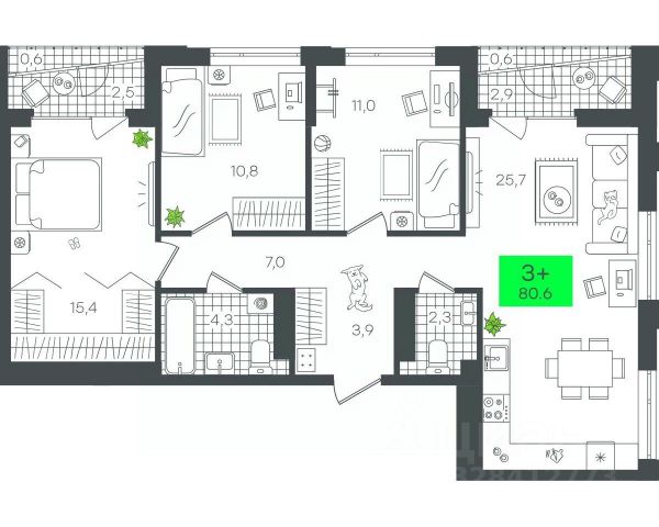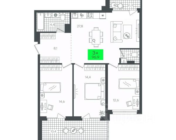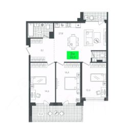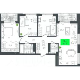 Трехкомнатная квартира от застройщика в ЖК "Беринг" на 4 этаже. Общая площадь: 79.9 кв.м. Высота потолков 2.72 м.