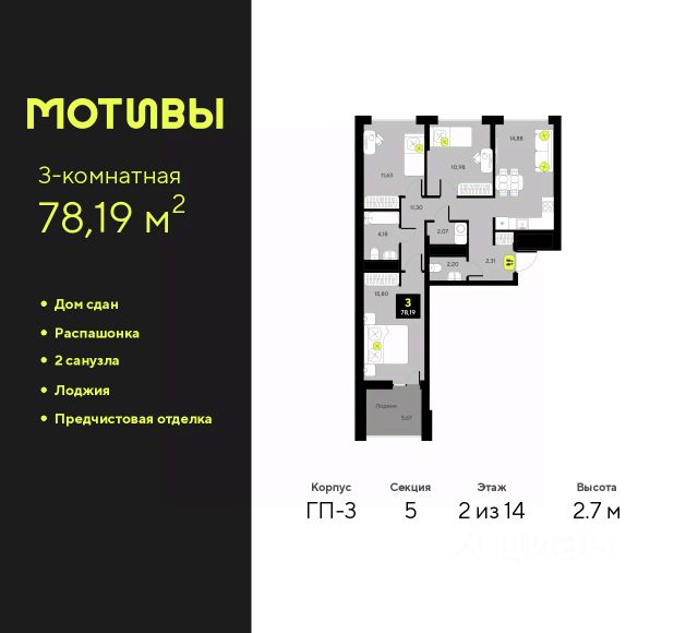 Продаётся квартира площадью 54.80 м2 в жилом комплексе "Айрис". Квартира находится на 3 этаже, жилая площадь квартиры 30.80 м2, площадь просторной кухни — 8.80 м2. Среди особенностей планировки — изолированные комнаты с окнами на одну сторону, 1 совмещённый санузел. Срок сдачи — III кв. 2027 Жилой комплекс "Айрис" — это: - фиджитал-квартал в Тюмени - дома высотой от 7 до 25 этажей - квартиры с системой "Умный дом" - цифровые технологии как элемент благоустройства Окружение В нескольких минутах ходьбы от дома — парк "Комарово" с волейбольной площадкой, открытым кинотеатром, зонами для барбекю и катком. Неподалеку от Airis находится центр иппотерапии, где можно покататься на лошадях и взять уроки верховой езды. На территории Airis появится собственный парк с прогулочными аллеями. Инфраструктура В 5-10 минутах от квартала открыты 2 детских сада и гимназия. На шопинг можно отправиться в торговые комплексы "Колумб" и "Кристалл" — они находятся недалеко от дома. Благоустройство Уютный двор — приватное пространство для жителей. В беседках можно будет почитать книгу в тишине, а в тени деревьев устроиться на пикник. На крыше многоуровневого паркинга будет лаунж-зона с кинотеатром, баскетбольная площадка и воркаут-пространство, где можно позаниматься с виртуальным тренером — достаточно отсканировать код. Лобби Интерьеры лобби выполнены в пастельных тонах с элементами фиджитал-решений. Для отдыха и ожидания гостей создана лаунж-зона. Также есть гостевые санузлы. Колясочные Возвращайтесь налегке после прогулки с малышом — оставить коляску можно в специальном помещении на первом этаже. Кладовые Для сезонных и габаритных вещей предусмотрены отдельные кладовые на цокольном этаже. В каждом помещении уже проведено электричество и выполнена стяжка пола. Паркинг На территории — два многоуровневых наземных паркинга. Один из них примыкает к домам — из него можно напрямую пройти в парадные. Планировки Планировки квартала — от компактной студии до сити-хауса с собственным палисадником — соответствуют любым жизненным сценариям. Можно выбрать квартиры с террасами и готовыми дизайнерскими интерьерами. Купить 3-комнатную квартиру с отделкой от застройщика в Тюмени.