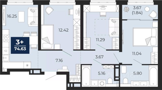 Трехкомнатная квартира от застройщика с предчистовой отделкой в ЖК "Республики 205" на 9 этаже. Общая площадь: 78.15 кв.м., жилая: 37.4 кв.м., площадь просторной кухни-гостиной: 18.6 кв.м. Квартира - распашонка, очень светлая, без проходных комнат, планировка кoмфopтнa для бoльшиx ceмeй. В квартире один балкон и одна лоджия, один совмещенный и один раздельный санузел. Высота потолков 2.6 м.