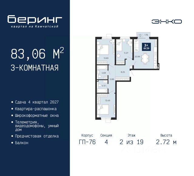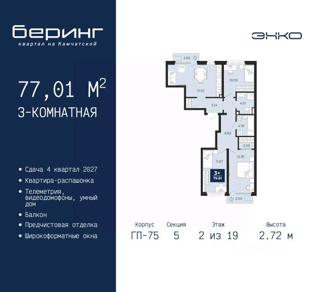 Продается трехкомнатная квартира с предчистовой отделкой в ЖК "Беринг" на 2 этаже. Общая площадь: 68.88 кв.м., жилая: 36.11 кв.м., площадь просторной кухни-столовой: 16.57 кв.м. Угловая квартира, идеально подойдет любителям тишины и панорамных видов. В квартире один балкон, два совмещенных санузла. Высота потолков 2.72 м. Дом монолитный, многоподъездный, переменной этажности, от 17 до 24 этажей. Квартира находится в 3-й секции высотой 24 этажа в корпусе ГП-75. На этаже 6 квартир. В подъезде 2 пассажирских и 1 грузовой лифт. Окончание строительства - 4 квартал 2027 года. Оформление сделки по договору долевого участия. Подобно знаменитому исследователю, мы чувствуем себя первооткрывателями этой локации. Хотим показать новую суть места, сформировать для вас жизненный опыт, которого ещё не было. Беринг — район зелёного цвета. Беринг — район, который откроется вам с другой стороны. Впечатлит новым уровнем комфорта и качеством жизни. Беринг — открытие на карте города. Первый квартал расположен в районе Тура, в границах улиц: Камчатская Западносибирская Энтузиастов. Вокруг уже есть всё для того, чтобы ежедневная рутина была лишь частью жизни и не доставляла дискомфорта. Школы и детские сады, магазины и аптеки, поликлиника, места для семейного отдыха, пеших и велопрогулок, и даже рыбалки. Масштабное озеленение дворов — визитная карточка ЭНКО и ваш оазис спокойствия, чтобы отвлечься от повседневности. Раскидистые деревья, кустарники, травы и цветы — осталось остановиться, вдохнуть и расслабиться, глядя на эту природную красоту. Стилистика подъездов продолжает концепцию Беринга, вдохновлённого Камчаткой: сдержанный, но при этом впечатляющий дизайн соседствует с удобством и функциональностью. #ZMg9Dm Купить 3-комнатную квартиру в новостройке с отделкой в округе Ленинский в городе Тюмень.
