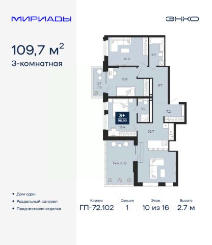 Дом монолитный, трехподъездный, высотой 10 этажей. Квартира находится в 1-й секции в корпусе ГП-7. На этаже 5 квартир. В подъезде 1 пассажирский и 1 грузовой лифт. Окончание строительства - 2 квартал 2026 года. Оформление сделки по договору долевого участия.