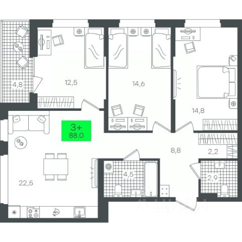 Продаётся квартира площадью 72.60 м2 в жилом комплексе "Айрис". Квартира находится на 3 этаже дома, который будет введен в эксплуатацию в 3 квартале 2027 года. Жилая площадь квартиры 28.90 м2, площадь просторной кухни — 21.00 м2. Среди особенностей планировки — изолированные комнаты с окнами на одну сторону, 1 совмещённый санузел. Жилой комплекс "Айрис" — это: фиджитал-квартал в Тюмени дома высотой от 7 до 25 этажей квартиры с системой "Умный дом" цифровые технологии как элемент благоустройства Срок сдачи — III кв. 2027 Окружение В нескольких минутах ходьбы от дома — парк "Комарово" с волейбольной площадкой, открытым кинотеатром, зонами для барбекю и катком. Неподалеку от Airis находится центр иппотерапии, где можно покататься на лошадях и взять уроки верховой езды. На территории Airis появится собственный парк с прогулочными аллеями. Инфраструктура В 5-10 минутах от квартала открыты 2 детских сада и гимназия. На шопинг можно отправиться в торговые комплексы "Колумб" и "Кристалл" — они находятся недалеко от дома. Благоустройство Уютный двор — приватное пространство для жителей. В беседках можно будет почитать книгу в тишине, а в тени деревьев устроиться на пикник. На крыше многоуровневого паркинга будет лаунж-зона с кинотеатром, баскетбольная площадка и воркаут-пространство, где можно позаниматься с виртуальным тренером — достаточно отсканировать код. Лобби Интерьеры лобби выполнены в пастельных тонах с элементами фиджитал-решений. Для отдыха и ожидания гостей создана лаунж-зона. Также есть гостевые санузлы. Колясочные Возвращайтесь налегке после прогулки с малышом — оставить коляску можно в специальном помещении на первом этаже. Кладовые Для сезонных и габаритных вещей предусмотрены отдельные кладовые на цокольном этаже. В каждом помещении уже проведено электричество и выполнена стяжка пола. Паркинг На территории — два многоуровневых наземных паркинга. Один из них примыкает к домам — из него можно напрямую пройти в парадные. Планировки Планировки квартала — от компактной студии до сити-хауса с собственным палисадником — соответствуют любым жизненным сценариям. Можно выбрать квартиры с террасами и готовыми дизайнерскими интерьерами. Продам 3-комнатную квартиру в новостройке в округе Калининский в городе Тюмень.