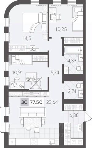 Квартира с 3 спальнями площадью 78,68 кв.м