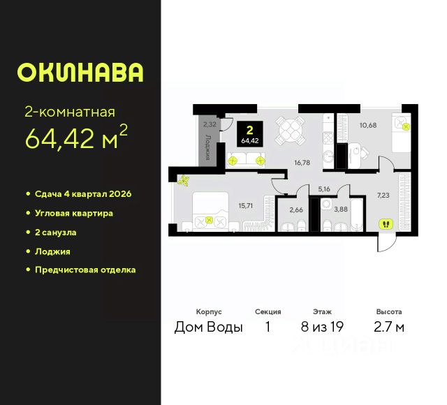 Продается 2-комн. квартира от застройщика с предчистовой отделкой в ЖК "Окинава" на 8 этаже. Общая площадь: 64.42 кв.м., жилая: 26.39 кв.м., площадь просторной кухни-столовой: 16.78 кв.м. Квартира угловая, очень светлая, естественная вентиляция при открытии окон. В квартире одна лоджия, один совмещенный и один раздельный санузел. Высота потолков 2.7 м.