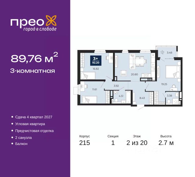 Трехкомнатная квартира с предчистовой отделкой в ЖК "Прео" на 2 этаже. Общая площадь: 96.06 кв.м., жилая: 42.81 кв.м., площадь просторной кухни-столовой: 23.8 кв.м. Угловая квартира, идеально подойдет любителям тишины и панорамных видов. В квартире одна лоджия, два совмещенных санузла. Высота потолков 2.7 м. Квартира находится в корпусе 215. Дом монолитный, одноподъездный, высотой 20 этажей. На этаже 8 квартир. В подъезде 1 пассажирский и 1 грузовой лифт. Окончание строительства - 4 квартал 2027 года. Оформление сделки по договору долевого участия. Преображенский — один из самых привлекательных районов для жизни! Это полностью самостоятельный жилой район с точки зрения инфраструктуры. Преображенский находится между Московским и Червишевским трактами в квартале улиц Закалужская — Вьюжная — Александра Протозанова. Не нужно ждать, когда появится инфраструктура — переезжайте на всё готовое. Вблизи расположены действующие школа и детский сад. В этом году откроется еще один сад, а в следующем году — школа. По соседству с Преображенским запланировано строительство городского парка "Комарово" площадью 38 гектар. За 10 минут можно доехать на автомобиле до крупных ТРЦ: "Лента", "Кристалл", "Леруа Мерлен", "Метро" и "Ашан". С 2018 года в районе открыт Соседский центр — пространство, созданное для формирования добрососедской среды, совместного досуга, общения и реализации соседских инициатив. Здесь проходят встречи соседей, а также сами жители района организовывают мероприятия. Организатором такого события может стать любой желающий. В квартирах выполнена качественная предчистовая отделка. Гладкие стены с финишным выравниванием по маякам. Ровный потолок для установки натяжного потолка. Установлены пятикамерные окна с двойным стеклопакетом (3 стекла). Дизайнерские холлы с видеонаблюдением, безбарьерным и прозрачным входом всегда светло и спокойно. На первом этаже есть просторные колясочные, где все жители могут оставлять свои коляски и велосипеды. В Преображенском есть всё, что нужно для активного отдыха и занятий спортом. Мы сделали большое футбольное поле с безопасным покрытием. Также установили хоккейный корт, который оборудован по всем необходимым стандартам. Во дворах можно делать упражнения на специальных площадках с турниками. Весь район мы обустроили велодорожками, которые связаны в единый маршрут. У нас есть сухие фонтаны, бьющие из земли, деревья, веревки, сетки, скалодром, газон, песок и резинка — осталось просто дать своему ребенку право на свободную игру. По-настоящему хорошие дворы — это те, которые дети предпочитают соцсетям и телевизору. Аккредитация в банках: ПАО "Газпромбанк", ПАО Банк "ВТБ", ПАО "Банк Уралсиб", "Сбербанк России", ОАО "Альфа-Банк" и других. #Zmvai1 Продается 3-комнатная квартира в новостройке в микрорайоне Тюменская Слобода в городе Тюмень.