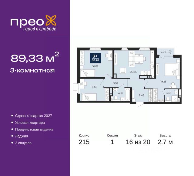 Продается трехкомнатная квартира с предчистовой отделкой в ЖК "Прео" на 2 этаже. Общая площадь: 96.06 кв.м., жилая: 42.81 кв.м., площадь просторной кухни-столовой: 23.8 кв.м. Угловая квартира, идеально подойдет любителям тишины и панорамных видов. В квартире одна лоджия, два совмещенных санузла. Высота потолков 2.7 м. Квартира находится в корпусе 215. Дом монолитный, одноподъездный, высотой 20 этажей. На этаже 8 квартир. В подъезде 1 пассажирский и 1 грузовой лифт. Окончание строительства - 4 квартал 2027 года. Оформление сделки по договору долевого участия. Преображенский — один из самых привлекательных районов для жизни! Это полностью самостоятельный жилой район с точки зрения инфраструктуры. Преображенский находится между Московским и Червишевским трактами в квартале улиц Закалужская — Вьюжная — Александра Протозанова. Не нужно ждать, когда появится инфраструктура — переезжайте на всё готовое. Вблизи расположены действующие школа и детский сад. В этом году откроется еще один сад, а в следующем году — школа. По соседству с Преображенским запланировано строительство городского парка "Комарово" площадью 38 гектар. За 10 минут можно доехать на автомобиле до крупных ТРЦ: "Лента", "Кристалл", "Леруа Мерлен", "Метро" и "Ашан". С 2018 года в районе открыт Соседский центр — пространство, созданное для формирования добрососедской среды, совместного досуга, общения и реализации соседских инициатив. Здесь проходят встречи соседей, а также сами жители района организовывают мероприятия. Организатором такого события может стать любой желающий. В квартирах выполнена качественная предчистовая отделка. Гладкие стены с финишным выравниванием по маякам. Ровный потолок для установки натяжного потолка. Установлены пятикамерные окна с двойным стеклопакетом (3 стекла). Дизайнерские холлы с видеонаблюдением, безбарьерным и прозрачным входом всегда светло и спокойно. На первом этаже есть просторные колясочные, где все жители могут оставлять свои коляски и велосипеды. В Преображенском есть всё, что нужно для активного отдыха и занятий спортом. Мы сделали большое футбольное поле с безопасным покрытием. Также установили хоккейный корт, который оборудован по всем необходимым стандартам. Во дворах можно делать упражнения на специальных площадках с турниками. Весь район мы обустроили велодорожками, которые связаны в единый маршрут. У нас есть сухие фонтаны, бьющие из земли, деревья, веревки, сетки, скалодром, газон, песок и резинка — осталось просто дать своему ребенку право на свободную игру. По-настоящему хорошие дворы — это те, которые дети предпочитают соцсетям и телевизору. Аккредитация в банках: ПАО "Банк Уралсиб", ПАО Банк "ВТБ", ПАО "Газпромбанк", ОАО "Альфа-Банк", "Сбербанк России" и других. #ZmVaii Продается 3-комнатная квартира в новостройке в микрорайоне Тюменская Слобода в городе Тюмень.