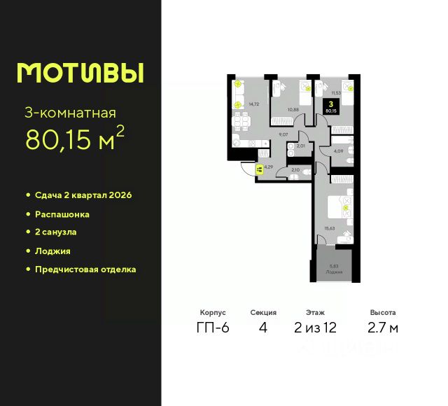 Дом монолитный, черырехподъездный, переменной этажности, от 14 до 21 этажей. Квартира находится во 2-й секции высотой 21 этаж в корпусе 211. На этаже 10 квартир. В подъезде 1 пассажирский и 1 грузовой лифт. Окончание строительства - 4 квартал 2026 года. Оформление сделки по договору долевого участия.