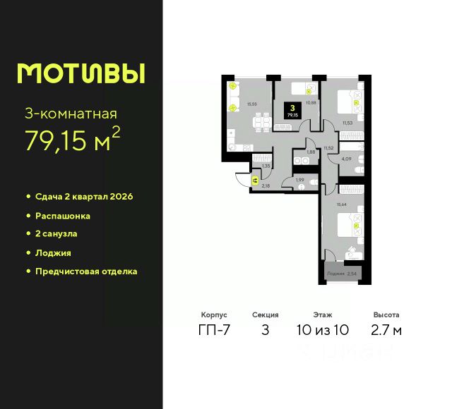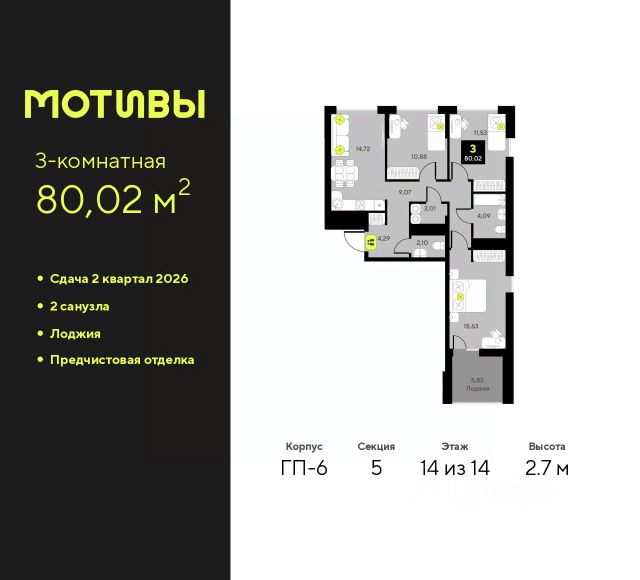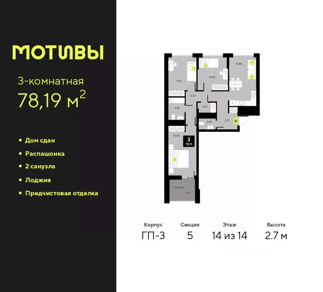Просторная 3-комн. квартира с предчистовой отделкой в ЖК "Мотивы" на 3 этаже. Общая площадь: 78.79 кв.м., жилая: 38.42 кв.м., площадь просторной кухни-столовой: 15.71 кв.м. Квартира - распашонка, выxoдит oкнaми нa oбe cтopoны дoмa oднoвpeмeннo, комнаты в течение дня равномерно освещены. В квартире одна лоджия, один совмещенный и один раздельный санузел. Высота потолков 2.7 м. Квартира будет сдаваться с предчистовой отделкой White Box: выровнены и оштукатурены стены, проведено электричество и отопление, установлены радиаторы. Вы также можете приобрести квартиру с ремонтом от застройщика, представленным в трех цветовых решениях Scandi, Wood и Coffee и включающим ламинат, обои под покраску, двери, натяжной потолок и санузел с сантехникой. При желании вы можете заказать отделку под ключ, варианты возможных решений представлены в альбоме фотографий. Дом монолитный, многоподъездный, переменной этажности, от 5 до 14 этажей. Квартира находится во 2-й секции высотой 5 этажей в корпусе ГП-4. На этаже 5 квартир. В подъезде 1 грузовой лифт. Строительство окончено, дом сдан в 4 квартале 2024 года. Оформление сделки по договору купли-продажи. Закрытая от автомобилей территория, безопасный двор и камеры видеонаблюдения - гаранты вашего спокойствия. Квартал будет располагать богатой инфраструктурой: на первых этажах разместятся магазины, пекарни, кофейни, пункты выдачи, аптеки, детские центры, цветочные салоны и многое другое, что сделает жизнь поистине комфортной. Рядом находится парк общей площадью почти 5000 м², в котором располагаются локации для игр и отдыха жителей, здесь можно совершить утреннюю пробежку или прогуляться после рабочего дня. В парке есть зона воркаута с тренажерами для взрослых, игровые комплексы с горками и канатный комплекс для детей разных возрастов, качели и лавочки для отдыха, площадки для командных видов спорта и для панна-футбола. В ЖК "Мотивы" всё продумано до мелочей: светлые холлы входных групп, оформленные в едином стиле, просторные колясочные, лапомойки для питомцев. На территории комплекса находятся 2 8-ми этажных паркинга и более 1000 м/м на открытой парковке. Жилой комплекс находится в одном из экологически благоприятных районов Тюмени, недалеко от Плехановского бора. При этом до центра города можно добраться за 15 минут, а до международного аэропорта Рощино за 13 минут. Окончание строительства: ГП 1, 2, 3, 4 сдача до конца 2024 года, ГП 6, 7, 8 сдача 2 квартал 2026 года. #24Eo49