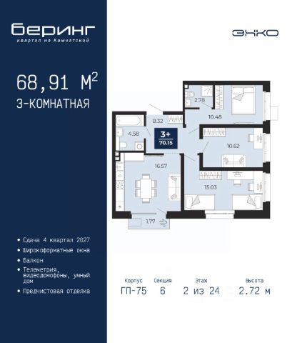 3-комн. квартира с предчистовой отделкой в ЖК "Беринг" на 2 этаже. Общая площадь: 68.88 кв.м., жилая: 36.11 кв.м., площадь просторной кухни-столовой: 16.57 кв.м. Угловая квартира, идеально подойдет любителям тишины и панорамных видов. В квартире один балкон, два совмещенных санузла. Высота потолков 2.72 м. Дом монолитный, многоподъездный, переменной этажности, от 17 до 24 этажей. Квартира находится в 3-й секции высотой 24 этажа в корпусе ГП-75. На этаже 6 квартир. В подъезде 2 пассажирских и 1 грузовой лифт. Окончание строительства - 4 квартал 2027 года. Оформление сделки по договору долевого участия. Подобно знаменитому исследователю, мы чувствуем себя первооткрывателями этой локации. Хотим показать новую суть места, сформировать для вас жизненный опыт, которого ещё не было. Беринг — район зелёного цвета. Беринг — район, который откроется вам с другой стороны. Впечатлит новым уровнем комфорта и качеством жизни. Беринг — открытие на карте города. Первый квартал расположен в районе Тура, в границах улиц: Камчатская Западносибирская Энтузиастов. Вокруг уже есть всё для того, чтобы ежедневная рутина была лишь частью жизни и не доставляла дискомфорта. Школы и детские сады, магазины и аптеки, поликлиника, места для семейного отдыха, пеших и велопрогулок, и даже рыбалки. Масштабное озеленение дворов — визитная карточка ЭНКО и ваш оазис спокойствия, чтобы отвлечься от повседневности. Раскидистые деревья, кустарники, травы и цветы — осталось остановиться, вдохнуть и расслабиться, глядя на эту природную красоту. Стилистика подъездов продолжает концепцию Беринга, вдохновлённого Камчаткой: сдержанный, но при этом впечатляющий дизайн соседствует с удобством и функциональностью. #2m99dm
