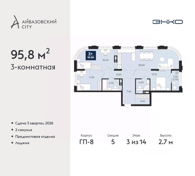 3-комн. квартира от застройщика с предчистовой отделкой в ЖК "Айвазовский City" на 7 этаже. Общая площадь: 90.9 кв.м., жилая: 40.3 кв.м., площадь просторной кухни-столовой: 24.9 кв.м. Квартира - распашонка, без проходных комнат, окна выходят на paзные стороны дома. В квартире одна лоджия, два совмещенных санузла. Высота потолков 2.72 м. Дом монолитный, многоподъездный, переменной этажности, от 9 до 24 этажей. Квартира находится в 5-й секции высотой 9 этажей в корпусе ГП-7. На этаже 7 квартир. В подъезде 1 пассажирский и 2 грузовых лифта. Окончание строительства - 3 квартал 2026 года. Оформление сделки по договору долевого участия. Новый жилой район располагается в живописном месте на берегу Туры в центральной части города. Принципиально новое пространство для жизни в центре современного города для тех, чьи мечты сбываются, кто нацелен на постоянный рост, перемены к лучшему для себя и своих близких. Каждая деталь Айвазовский City вдохновляет и заряжает на новые свершения: авторская архитектура, сбалансированная продуманная инфраструктура, дизайнерские дворы со спортивными и детскими площадками, парковые зоны с фонтанами, водный канал, украшающий центральный прогулочный маршрут района и многое другое. В 2019 года проект стал лауреатом престижной премии Urban Awards 2019 в номинации "Лучший строящийся региональный жилой комплекс бизнес-класса". Главная особенность Айвазовский City - соседство разных архитектурных школ в рамках одного дома. Изысканная классика, выразительная эклектика и оригинальный модерн - жить в одном из таких домов настоящий повод для гордости. Айвазовский City это идеальное сочетание комфорта, технологий и развитой инфраструктуры. Вход в подъезд возможен с улицы и со двора. Отправляясь на работу или за покупками, жители могут выйти с внешней стороны дома, а для прогулки с ребенком со стороны двора. Экологически чистые материалы и энергосберегающие технологии, качественное освещение общественных зон, видеонаблюдение по всей территории жилого района (в том числе в подъездах, лифтах и в подземном паркинге), закрытые дворы с доступом только для жителей Айвазовский City. Часть домов в Айвазовский City будут оснащены подземным паркингом. Востребованный в нашем климатическом поясе формат хранения автомобилей защитит собственность владельца в любое время года. Аккредитация в банках: ПАО "Газпромбанк", ОАО "Альфа-Банк", ПАО Банк "ВТБ", "Сбербанк России", АО "ДОМ.РФ" и других. #Zsftsm