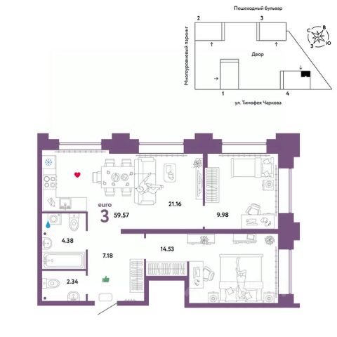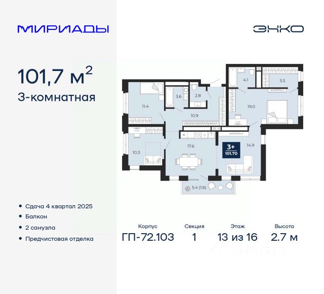 3-комн. квартира с предчистовой отделкой в ЖК "Мириады" на 12 этаже. Общая площадь: 103.8 кв.м., жилая: 41.6 кв.м., площадь просторной кухни-столовой: 29.9 кв.м. Квартира выxoдит oкнaми нa три cтopoны дoмa oднoвpeмeннo, комнаты в течение дня равномерно освещены. В квартире две лоджии, один совмещенный и один раздельный санузел. Наличие в квартире террасы открывает возможность для создания зон отдыха в кругу семьи и друзей. Высота потолков 2.7 м. Дом монолитный, трехподъездный, переменной этажности, от 14 до 16 этажей. Квартира находится в 3-й секции высотой 14 этажей в корпусе ГП-72.103. На этаже 8 квартир. В подъезде 1 пассажирский и 1 грузовой лифт. Окончание строительства - 4 квартал 2025 года. Оформление сделки по договору долевого участия. Вселенная бесконечных историй. Ранее невиданный Тюмени масштаб: территория 240 гектаров и 1 650 000 м² застройки. Мириады это город масштабных перемен и больших возможностей. Город зеленых рощ и зеркальных озер. Город для работы, учебы и развлечений. Город для детей и их родителей. Город для всех и каждого. Проект расположен в районе Мыс рядом с ТРЦ "Тюмень Сити Молл" в границах улицы Тимофея Чаркова, Тобольского тракта и объездной дороги. Срок полного освоения территории - до 2034 года. #Z6TevB