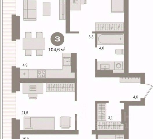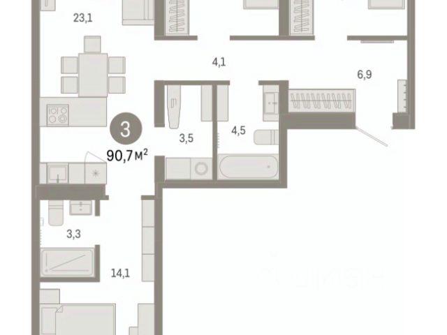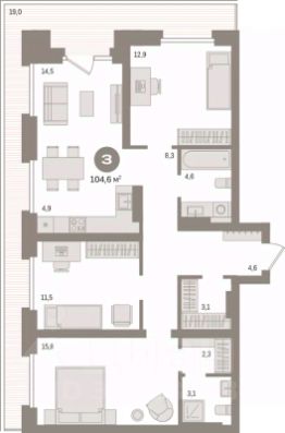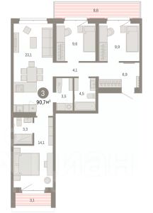 Планировка квартиры включает кухню, соединенную с гостиной, две спальни, одна из которых может быть детской комнатой, а также прихожую с гардеробной, раздельный санузел и лоджию (на кухне).