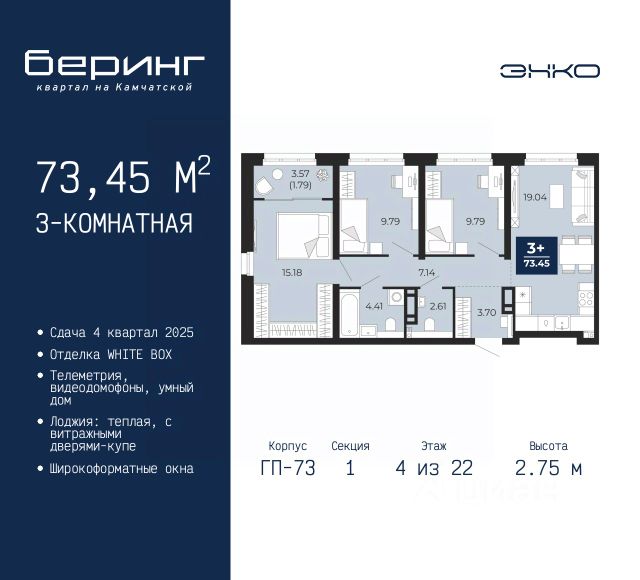 Продается 3-комн. квартира в ЖК "Беринг" на 9 этаже. Квартира без отделки, полностью готова к ремонту. Общая площадь: 79.77 кв.м., жилая: 38.26 кв.м., площадь просторной кухни-столовой: 19.75 кв.м. Угловая квартира, идеально подойдет любителям тишины и панорамных видов. В квартире одна лоджия, один совмещенный и один раздельный санузел. Высота потолков 2.75 м. Дом монолитный, многоподъездный, переменной этажности, от 9 до 22 этажей. Квартира находится в 73.5-й секции высотой 21 этаж в корпусе ГП-73. На этаже 6 квартир. В подъезде 1 пассажирский и 1 грузовой лифт. Окончание строительства - 4 квартал 2025 года. Оформление сделки по договору долевого участия. Подобно знаменитому исследователю, мы чувствуем себя первооткрывателями этой локации. Хотим показать новую суть места, сформировать для вас жизненный опыт, которого ещё не было. Беринг — район зелёного цвета. Беринг — район, который откроется вам с другой стороны. Впечатлит новым уровнем комфорта и качеством жизни. Беринг — открытие на карте города. Первый квартал расположен в районе Тура, в границах улиц: Камчатская Западносибирская Энтузиастов. Вокруг уже есть всё для того, чтобы ежедневная рутина была лишь частью жизни и не доставляла дискомфорта. Школы и детские сады, магазины и аптеки, поликлиника, места для семейного отдыха, пеших и велопрогулок, и даже рыбалки. Масштабное озеленение дворов — визитная карточка ЭНКО и ваш оазис спокойствия, чтобы отвлечься от повседневности. Раскидистые деревья, кустарники, травы и цветы — осталось остановиться, вдохнуть и расслабиться, глядя на эту природную красоту. Стилистика подъездов продолжает концепцию Беринга, вдохновлённого Камчаткой: сдержанный, но при этом впечатляющий дизайн соседствует с удобством и функциональностью. #Zs3T82 Продается 3-комнатная квартира с лоджией в Тюмени.