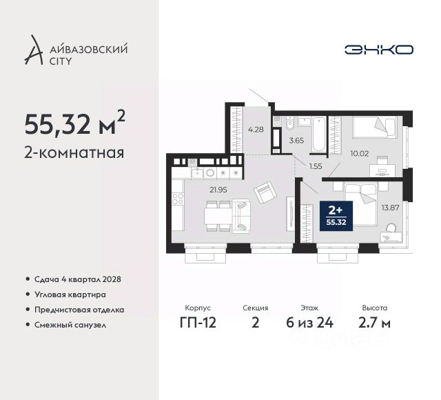 3-комн. квартира с предчистовой отделкой в ЖК "Окинава" на 4 этаже. Общая площадь: 100.38 кв.м., жилая: 43.66 кв.м., площадь просторной кухни-столовой: 29.66 кв.м. Квартира - распашонка, без проходных комнат, окна выходят на paзные стороны дома. В квартире одна лоджия, один совмещенный и один раздельный санузел. Высота потолков 2.7 м.