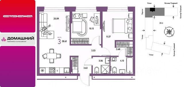Новая квартира в ЖК "Домашний" напрямую от федеральной группы компаний "Страна Девелопмент". Финансовый партнер — банк "ДОМ.РФ". Продается 3комнатная квартира на 13 этаже от застройщика Страна Девелопмент. Площадь квартиры 55,02 кв. м. ЖК "ДОМАШНИЙ" Жилой комплекс "Домашний" это первый цифровой район в Сибири, где жители заходят в парадные по Face ID, автомобили заезжают в паркинг по сканированию номера, а лифт автоматически спускается на первый этаж при открытии домофона. Даже во дворах — USB-розетки и беседки с подогревом. ПРЕИМУЩЕСТВА -Школа, зеленый сквер и пешеходный бульвар прямо внутри квартала -Закрытые дворы у каждого дома для активного и спокойного отдыха -Охрана, видеонаблюдение 24/7 и доступ к камерам в мобильном приложении -Сквозные парадные с прозрачными входными группами, колясочными и велосипедными -Паркинг с въездом по считыванию номеров, системой контроля выбросов CO2, тележками для покупок и велопарковкой -Торговая галерея на первом этаже дома ОТДЕЛКА Квартиры сдаются с предчистовой отделкой: произведена разводка электричества и отопления, выполнена стяжка пола, стены выровнены "под маяк", установлены розетки, выключатели и радиаторы. ДИЗАЙНЕРСКАЯ ОТДЕЛКА При покупке квартиры в ЖК "Домашний" можно включить стоимость ремонта в ипотеку. Пять вариантов на выбор: Хлопковая нить, Серый шторм, Белый камень, Шалфей, Голубой вереск. СПОСОБЫ ПОКУПКИ Сотрудники "Страна Девелопмент" будут сопровождать вас на каждом этапе сделки, помогут получить одобрение по ипотеке или снизить ежемесячный платеж. - ипотека - материнский капитал -100% оплата наличными Продается 3-комнатная квартира на улице Андрея Кореневского в городе Тюмень.
