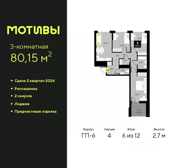 Трехкомнатная квартира с предчистовой отделкой в ЖК "Мотивы" на 12 этаже. Общая площадь: 78.19 кв.м., жилая: 38.41 кв.м., площадь просторной кухни-столовой: 14.88 кв.м. Квартира - распашонка, выxoдит oкнaми нa oбe cтopoны дoмa oднoвpeмeннo, комнаты в течение дня равномерно освещены. В квартире одна лоджия, один совмещенный и один раздельный санузел. Высота потолков 2.7 м. Квартира будет сдаваться с предчистовой отделкой White Box: выровнены и оштукатурены стены, проведено электричество и отопление, установлены радиаторы. Вы также можете приобрести квартиру с ремонтом от застройщика, представленным в трех цветовых решениях Scandi, Wood и Coffee и включающим ламинат, обои под покраску, двери, натяжной потолок и санузел с сантехникой. При желании вы можете заказать отделку под ключ, варианты возможных решений представлены в альбоме фотографий. Дом монолитный, черырехподъездный, переменной этажности, от 12 до 14 этажей. Квартира находится в 4-й секции высотой 12 этажей в корпусе ГП-3. На этаже 5 квартир. В подъезде 1 пассажирский и 1 грузовой лифт. В настоящее время строительство окончено, дом сдан в 4 квартале 2024 года. Оформление сделки по договору купли-продажи. Закрытая от автомобилей территория, безопасный двор и камеры видеонаблюдения - гаранты вашего спокойствия. Квартал будет располагать богатой инфраструктурой: на первых этажах разместятся магазины, пекарни, кофейни, пункты выдачи, аптеки, детские центры, цветочные салоны и многое другое, что сделает жизнь поистине комфортной. Рядом находится парк общей площадью почти 5000 м², в котором располагаются локации для игр и отдыха жителей, здесь можно совершить утреннюю пробежку или прогуляться после рабочего дня. В парке есть зона воркаута с тренажерами для взрослых, игровые комплексы с горками и канатный комплекс для детей разных возрастов, качели и лавочки для отдыха, площадки для командных видов спорта и для панна-футбола. В ЖК "Мотивы" всё продумано до мелочей: светлые холлы входных групп, оформленные в едином стиле, просторные колясочные, лапомойки для питомцев. На территории комплекса находятся 2 8-ми этажных паркинга и более 1000 м/м на открытой парковке. Жилой комплекс находится в одном из экологически благоприятных районов Тюмени, недалеко от Плехановского бора. При этом до центра города можно добраться за 15 минут, а до международного аэропорта Рощино за 13 минут. Окончание строительства: ГП 1, 2, 3, 4 сдача до конца 2024 года, ГП 6, 7, 8 сдача 2 квартал 2026 года. #2WE0Wt