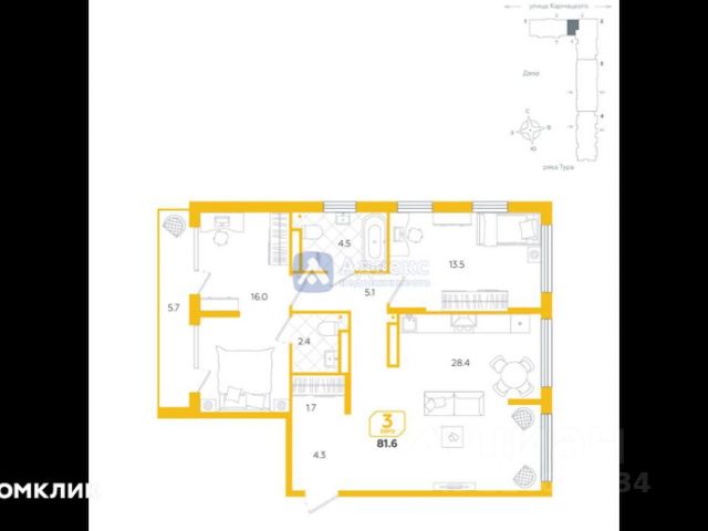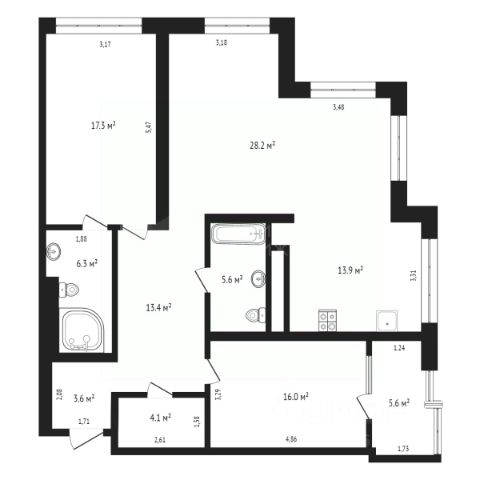 кухню-гостиную, три отдельные спальни, гардероб и два просторных санузла.