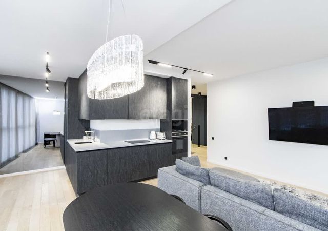 Планировка квартиры включает кухню, соединенную с гостиной, две спальни, одна из которых может быть детской комнатой, а также прихожую с гардеробной, разде