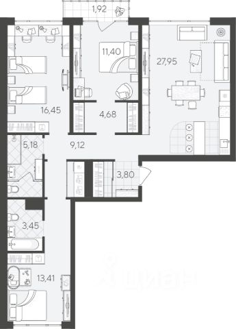 Квартира с кухней-гостиной и тремя спальнями в кварталах "На Минской". Особенности планировки: вид во двор, лоджия, разнесённые спальни, предчистовая отделка, мастер-спальня, постирочная, балкон.