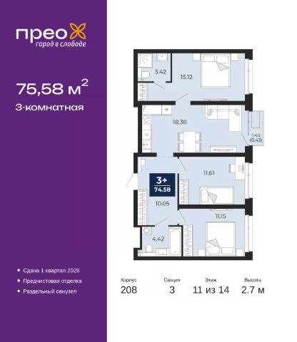 Квартира находится в Квартале мечтателей "Астро". Жилой комплекс от "Паритет Девелопмент" строится в Тюменской слободе на улице Сергея Джанбровского 19 к1. Характеристики квартиры: этаж - 3 количество комнат - 4 номер помещения - 290 площадь квартиры - 73,9 кв.м высота потолка - 2,72 м Это экологически чистая зона с видом на лес с разнообразием хвойных и лиственных деревьев. Вся инфраструктура в шаговой доступности - магазины, кафе, пункты выдачи. В планах - школа и детский сад. Закрытый двор без машин позволит жителям чувствовать себя в безопасности в кругу своих. В нем предусмотрены детские и спортивные площадки, зоны отдыха. Жилой комплекс "Астро" включает 6 секций высотой 9-15 этажей с подземным паркингом. В общей сложности в нем всего 384 квартиры. На 1 этажах появится коммерческая инфраструктура. Срок сдачи 1 кв. 2026 года. Планировки учитывают различные сценарии жизни, продуманы и функциональны. В квартирах выполнена стяжка пола с шумоизоляцией, выровнены стены, разводка отопления - горизонтальная - в полу, установлены счетчики с телеметрией. Эту планировку можно приобрести с готовой отделкой в темном или светлом цветовом решении, а также с кухонным гарнитуром, мебелью и декором. Большие окна наполняют квартиру естественным светом. Выделены зоны для работы и отдыха. Просторный санузел позволяет свободно разместить и ванну, и стиральную машину. Большая кухня имеет функциональную планировку, где комфортно собираться всей семьей или с друзьями. Здесь легко расположится кухонный гарнитур, стол со стульями и место для отдыха.