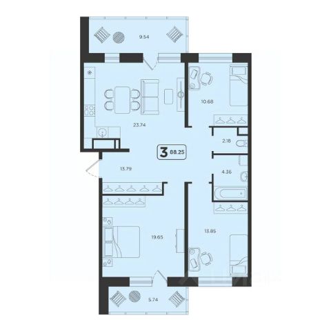 Продаётся 3-комнатная квартира в строящемся доме (ГП-4), срок сдачи: IV-кв. 2027, общей площадью 88.25 кв.м., на 6 этаже. Расположение, транспортная доступность Жилой комплекс "Горизонт" - это микрорайон, в состав которого входит девятнадцать 17-этажных односекционных монолитно-кирпичных зданий бюджетного класса. Микрорайон находится в северной части Тюмени, в Центральном административном округе, рядом с улицами Дружбы, Мельникайте и Тобольским трактом. Здесь ходит более десяти маршрутов общественного транспорта, на котором можно добраться до любого района города. К центральной части Тюмени от "Горизонта" можно доехать менее чем за пятнадцать минут. Инфраструктура Рядом с "Горизонтом" находятся: детские сады 165, 28, 63, детский сад-ясли 172, лицей 81, школа 36, поликлиника 8, супермаркеты "Магнит" и "Пятерочка", торговые центры "Ватутинский", "Северный", "Престиж". В соседних микрорайонах множество объектов инфраструктуры: торгово-развлекательный центр "Тюмень Сити Молл", (где находятся гипермаркеты "Ашан Сити", "Эльдорадо", десятки магазинов и бутиков, кафе, рестораны, боулинг, ручной зоопарк и кинотеатр), торговые центры "Зеленый берег", "Абсолют", колледж водного транспорта, гипермаркеты "Лента", "Леруа Мерлен", рынок "Лесная сказка", Дом культуры "Водник", спорткомплекс "Гагаринский" с 25-метровым бассейном, кроссфит-залом и паровой комнатой, спортивно-оздоровительный комплекс "Автотеплотехник", филиал Сбербанка, школа 48 им. Д.М. Карбышева. Экологическая ситуация в месте расположения "Горизонта" оценивается как очень хорошая. Микрорайон находится практически на границе с парком им. Гагарина, в нескольких сотнях метров от озер Алебашево и Круглое, рядом с Ватутинской рощей, садом Дружба и рекой Тура. Из окон зданий комплекса открываются живописные виды на великолепные окрестности. Надежность застройщика Микрорайон "Горизонт" построила тюменская компания "Аква", входящая в состав группы компаний ARSIB holding group, история которой началась в 1957 году с предприятия "Тюменьоблснабсбыт" Группа компаний ARSIB holding group занимается несколькими видами деятельности (сельским хозяйством, производством продуктов питания, торговлей, девелопментом), ей принадлежит ряд крупных торговых и торгово-развлекательных центров в Тюмени, а также Тюменский молочный завод. Микрорайон "Горизонт" - это первый проект компании ARSIB holding group на тюменском рынке жилищного строительства. Архитектурная концепция "Горизонта" была разработана компанией "Реконструкция 2000 и К". Основные строительно-монтажные работы при возведении микрорайона выполнила компания ООО "Строительно-монтажное управление 2". Архитектура В домах микрорайона "Горизонт" представлены студии и квартиры с количеством комнат от одной до трех площадью от 23,90 кв. м до 81,37 кв. м с потолками высотой 270 см. Все квартиры продаются с предчистовой отделкой: с входными металлическими сейф-дверями, стяжкой пола, остекленными балконами и лоджиями, горизонтальной разводкой труб отопле