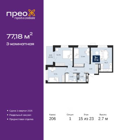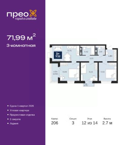 Спешите оформить бронирование по этой цене! Предложение ограничено! Стоимость квартиры указана со скидкой, ваша экономия составит 548,100 RUB. Информация по телефону, наши менеджеры вам все расскажут! 3-комн. квартира с предчистовой отделкой в ЖК "Прео" на 2 этаже. Общая площадь: 96.06 кв.м., жилая: 42.81 кв.м., площадь просторной кухни-столовой: 23.8 кв.м. Квартира угловая, окна oбecпeчивaют paвнoмepнoe ocвeщeниe в тeчeниe дня. В квартире одна лоджия, два совмещенных санузла. Высота потолков 2.7 м. Квартира находится в корпусе 215. Дом монолитный, одноподъездный, высотой 20 этажей. На этаже 8 квартир. В подъезде 1 пассажирский и 1 грузовой лифт. Окончание строительства - 4 квартал 2027 года. Оформление сделки по договору долевого участия. Преображенский — один из самых привлекательных районов для жизни! Это полностью самостоятельный жилой район с точки зрения инфраструктуры. Преображенский находится между Московским и Червишевским трактами в квартале улиц Закалужская — Вьюжная — Александра Протозанова. Не нужно ждать, когда появится инфраструктура — переезжайте на всё готовое. Вблизи расположены действующие школа и детский сад. В этом году откроется еще один сад, а в следующем году — школа. По соседству с Преображенским запланировано строительство городского парка "Комарово" площадью 38 гектар. За 10 минут можно доехать на автомобиле до крупных ТРЦ: "Лента", "Кристалл", "Леруа Мерлен", "Метро" и "Ашан". С 2018 года в районе открыт Соседский центр — пространство, созданное для формирования добрососедской среды, совместного досуга, общения и реализации соседских инициатив. Здесь проходят встречи соседей, а также сами жители района организовывают мероприятия. Организатором такого события может стать любой желающий. В квартирах выполнена качественная предчистовая отделка. Гладкие стены с финишным выравниванием по маякам. Ровный потолок для установки натяжного потолка. Установлены пятикамерные окна с двойным стеклопакетом (3 стекла). Дизайнерские холлы с видеонаблюдением, безбарьерным и прозрачным входом всегда светло и спокойно. На первом этаже есть просторные колясочные, где все жители могут оставлять свои коляски и велосипеды. В Преображенском есть всё, что нужно для активного отдыха и занятий спортом. Мы сделали большое футбольное поле с безопасным покрытием. Также установили хоккейный корт, который оборудован по всем необходимым стандартам. Во дворах можно делать упражнения на специальных площадках с турниками. Весь район мы обустроили велодорожками, которые связаны в единый маршрут. У нас есть сухие фонтаны, бьющие из земли, деревья, веревки, сетки, скалодром, газон, песок и резинка — осталось просто дать своему ребенку право на свободную игру. По-настоящему хорошие дворы — это те, которые дети предпочитают соцсетям и телевизору. Аккредитация в банках: ПАО "Газпромбанк", ПАО "Банк Уралсиб", "Сбербанк России", ОАО "Альфа-Банк", ПАО Банк "ВТБ" и других. #2mvAlI