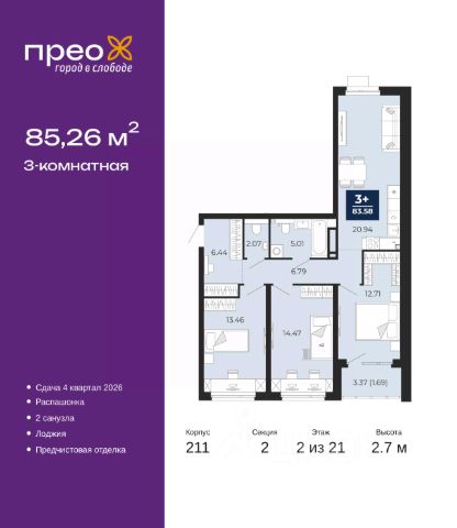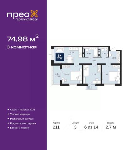 Трехкомнатная квартира с предчистовой отделкой в ЖК "Прео" на 11 этаже. Общая площадь: 74.98 кв.м., жилая: 36.25 кв.м., площадь просторной кухни-столовой: 15.75 кв.м. Квартира угловая, очень светлая, естественная вентиляция при открытии окон. В квартире один балкон и одна лоджия, один раздельный санузел. Высота потолков 2.7 м.