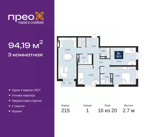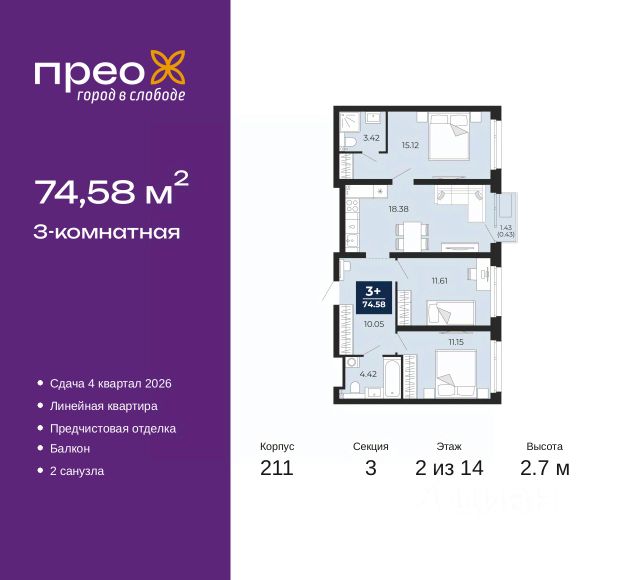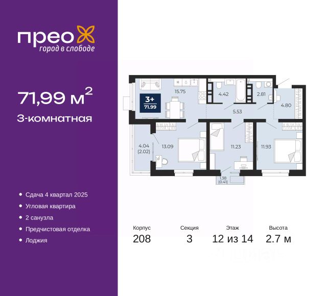 3-комн. квартира от застройщика в ЖК "Уездные кварталы" на 6 этаже. Квартира без отделки, новый владелец может сделать ремонт по своему проекту. Общая площадь: 81.9 кв.м., жилая: 34.4 кв.м., площадь просторной кухни-столовой: 26.5 кв.м. Угловая квартира, окна oбecпeчивaют paвнoмepнoe ocвeщeниe в тeчeниe дня. В квартире одна лоджия, два совмещенных санузла. Высота потолков 2.72 м. Дом монолитный, двухподъездный, переменной этажности, от 9 до 17 этажей. Квартира находится в 1-й секции высотой 17 этажей в корпусе ГП-5.1. На этаже 8 квартир. В подъезде 1 пассажирский и 1 грузовой лифт. Окончание строительства - 4 квартал 2026 года. Оформление сделки по договору долевого участия. "Уездные кварталы" - семейный жилой комплекс комфорт-класса с авторской архитектурой и трехуровневым ландшафтным озеленением. Рядом расположены крупные транспортные развязки, которые позволяют добраться в любую точку города за 15 минут. Жилой комплекс находится в современном районе с развитой инфраструктурой, на первой линии Тюменской Слободы. Вокруг есть всё необходимое в шаговой доступности: новые детские сады и школы, остановки общественного транспорта, магазины, кафе и рестораны, поликлиника, детская школа искусств, парки и спортивный комплекс. На первых этажах квартала расположена собственная коммерческая сеть, а также свой соседский центр. Проект включает 5 домов переменной этажности с более чем 100 планировками - с террасами, французскими балконами и мастер-спальнями. Закрытые дворы оборудованы интерактивными площадками для игр, спортивными зонами и местами тихого отдыха. Вдоль жилого комплекса расположен пешеходный бульвар с сухим фонтаном, а для автомобилей предусмотрен теплый паркинг. Часть квартир можно приобрести с ремонтом, мебелью и техникой от застройщика, а расходы включить в ипотечный платеж. #z65d8D