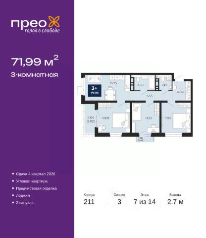 Продается 3-комн. квартира с предчистовой отделкой в ЖК "Прео" на 7 этаже. Общая площадь: 71.99 кв.м., жилая: 36.25 кв.м., площадь просторной кухни-столовой: 15.75 кв.м. Угловая квартира, очень светлая, естественная вентиляция при открытии окон. В квартире одна лоджия, один совмещенный и один раздельный санузел. Высота потолков 2.7 м.