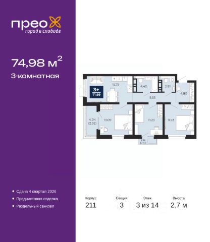 Квартира находится в Квартале мечтателей "Астро". Жилой комплекс от "Паритет Девелопмент" строится в Тюменской слободе на улице Сергея Джанбровского 19 к1. Характеристики квартиры: этаж - 3 количество комнат - 4 номер помещения - 290 площадь квартиры - 73,9 кв.м высота потолка - 2,72 м Это экологически чистая зона с видом на лес с разнообразием хвойных и лиственных деревьев. Вся инфраструктура в шаговой доступности - магазины, кафе, пункты выдачи. В планах - школа и детский сад. Закрытый двор без машин позволит жителям чувствовать себя в безопасности в кругу своих. В нем предусмотрены детские и спортивные площадки, зоны отдыха. Жилой комплекс "Астро" включает 6 секций высотой 9-15 этажей с подземным паркингом. В общей сложности в нем всего 384 квартиры. На 1 этажах появится коммерческая инфраструктура. Срок сдачи 1 кв. 2026 года. Планировки учитывают различные сценарии жизни, продуманы и функциональны. В квартирах выполнена стяжка пола с шумоизоляцией, выровнены стены, разводка отопления - горизонтальная - в полу, установлены счетчики с телеметрией. Эту планировку можно приобрести с готовой отделкой в темном или светлом цветовом решении, а также с кухонным гарнитуром, мебелью и декором. Большие окна наполняют квартиру естественным светом. Выделены зоны для работы и отдыха. Просторный санузел позволяет свободно разместить и ванну, и стиральную машину. Большая кухня имеет функциональную планировку, где комфортно собираться всей семьей или с друзьями. Здесь легко расположится кухонный гарнитур, стол со стульями и место для отдыха.