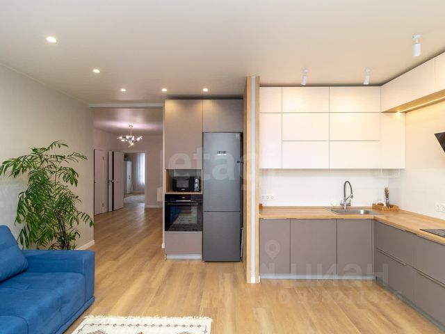 Просторная кухня-гостиная оборудована всей встроенной техникой Bosch: холодильник, варочная панель, вытяжка, духовой шкаф, микроволновая печь и посудомоечная машина, кондиционер "Haier", с эффектом драконий глаз, телевизор "Samsumg". стол раскладной, 4 стула, современный диван.