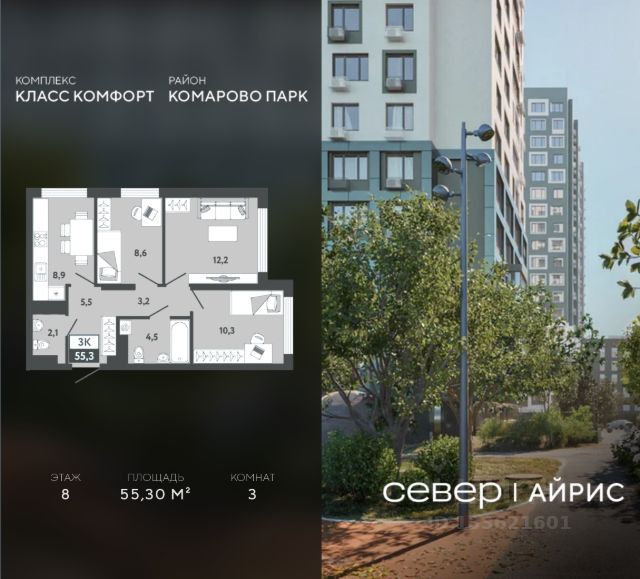 Продаётся квартира площадью 54.80 м2 в жилом комплексе "Айрис". Квартира находится на 3 этаже, жилая площадь квартиры 30.80 м2, площадь просторной кухни — 8.80 м2. Среди особенностей планировки — изолированные комнаты с окнами на одну сторону, 1 совмещённый санузел. Срок сдачи — III кв. 2027 Жилой комплекс "Айрис" — это: - фиджитал-квартал в Тюмени - дома высотой от 7 до 25 этажей - квартиры с системой "Умный дом" - цифровые технологии как элемент благоустройства Окружение В нескольких минутах ходьбы от дома — парк "Комарово" с волейбольной площадкой, открытым кинотеатром, зонами для барбекю и катком. Неподалеку от Airis находится центр иппотерапии, где можно покататься на лошадях и взять уроки верховой езды. На территории Airis появится собственный парк с прогулочными аллеями. Инфраструктура В 5-10 минутах от квартала открыты 2 детских сада и гимназия. На шопинг можно отправиться в торговые комплексы "Колумб" и "Кристалл" — они находятся недалеко от дома. Благоустройство Уютный двор — приватное пространство для жителей. В беседках можно будет почитать книгу в тишине, а в тени деревьев устроиться на пикник. На крыше многоуровневого паркинга будет лаунж-зона с кинотеатром, баскетбольная площадка и воркаут-пространство, где можно позаниматься с виртуальным тренером — достаточно отсканировать код. Лобби Интерьеры лобби выполнены в пастельных тонах с элементами фиджитал-решений. Для отдыха и ожидания гостей создана лаунж-зона. Также есть гостевые санузлы. Колясочные Возвращайтесь налегке после прогулки с малышом — оставить коляску можно в специальном помещении на первом этаже. Кладовые Для сезонных и габаритных вещей предусмотрены отдельные кладовые на цокольном этаже. В каждом помещении уже проведено электричество и выполнена стяжка пола. Паркинг На территории — два многоуровневых наземных паркинга. Один из них примыкает к домам — из него можно напрямую пройти в парадные. Планировки Планировки квартала — от компактной студии до сити-хауса с собственным палисадником — соответствуют любым жизненным сценариям. Можно выбрать квартиры с террасами и готовыми дизайнерскими интерьерами.