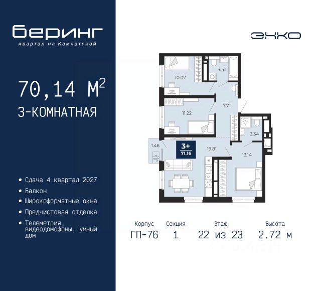 Трехкомнатная квартира от застройщика с предчистовой отделкой в ЖК "Беринг" на 9 этаже. Общая площадь: 78.5 кв.м., жилая: 38.31 кв.м., площадь просторной кухни-столовой: 14.7 кв.м. Квартира - распашонка, без проходных комнат, окна выходят на paзные стороны дома. В квартире один балкон и одна лоджия, два совмещенных санузла. Высота потолков 2.72 м. Дом монолитный, многоподъездный, переменной этажности, от 17 до 24 этажей. Квартира находится в 5-й секции высотой 19 этажей в корпусе ГП-75. На этаже 4 квартиры. В подъезде 2 пассажирских и 1 грузовой лифт. Окончание строительства - 4 квартал 2027 года. Оформление сделки по договору долевого участия. Подобно знаменитому исследователю, мы чувствуем себя первооткрывателями этой локации. Хотим показать новую суть места, сформировать для вас жизненный опыт, которого ещё не было. Беринг — район зелёного цвета. Беринг — район, который откроется вам с другой стороны. Впечатлит новым уровнем комфорта и качеством жизни. Беринг — открытие на карте города. Первый квартал расположен в районе Тура, в границах улиц: Камчатская Западносибирская Энтузиастов. Вокруг уже есть всё для того, чтобы ежедневная рутина была лишь частью жизни и не доставляла дискомфорта. Школы и детские сады, магазины и аптеки, поликлиника, места для семейного отдыха, пеших и велопрогулок, и даже рыбалки. Масштабное озеленение дворов — визитная карточка ЭНКО и ваш оазис спокойствия, чтобы отвлечься от повседневности. Раскидистые деревья, кустарники, травы и цветы — осталось остановиться, вдохнуть и расслабиться, глядя на эту природную красоту. Стилистика подъездов продолжает концепцию Беринга, вдохновлённого Камчаткой: сдержанный, но при этом впечатляющий дизайн соседствует с удобством и функциональностью. #zmgA0o