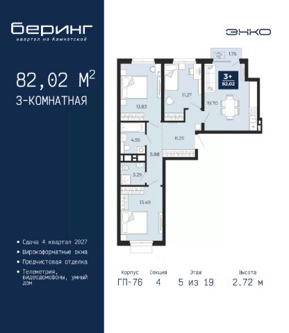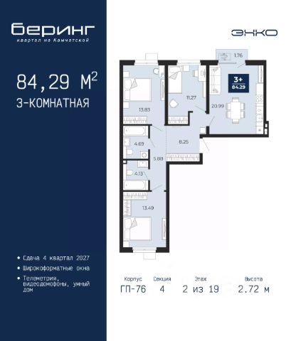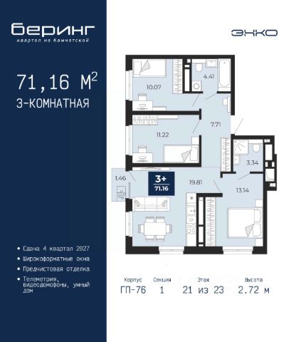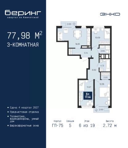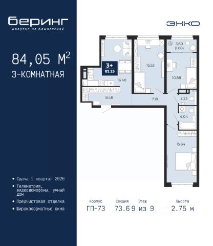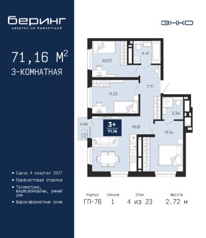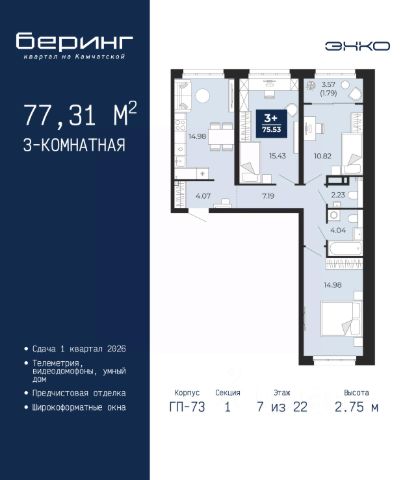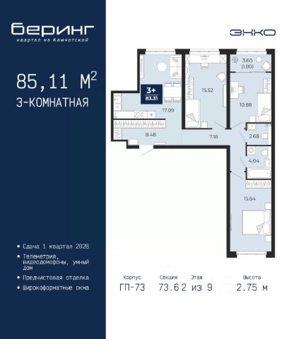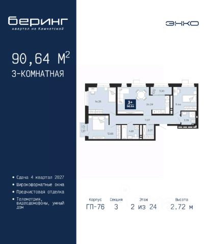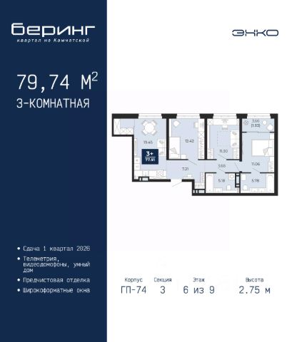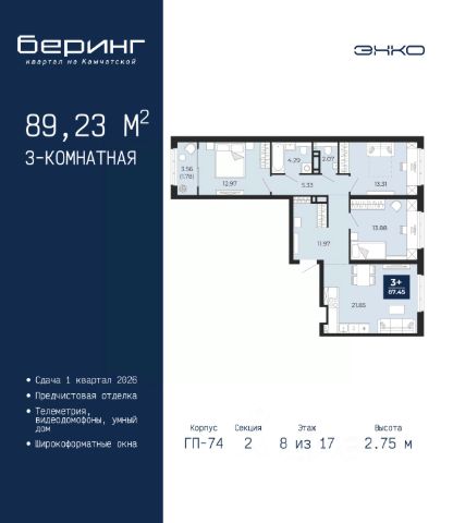 Успейте оформить бронирование, пока действует скидка, предложение ограничено! Стоимость квартиры указана со скидкой, ваша экономия составит 537,860 руб. Звоните, мы вам все подробно расскажем. Трехкомнатная квартира от застройщика с предчистовой отделкой в ЖК "Беринг" на 4 этаже. Общая площадь: 89.29 кв.м. Высота потолков 2.75 м. Дом монолитный, многоподъездный, переменной этажности, от 9 до 21 этажей. Квартира находится в 74.1-й секции высотой 21 этаж в корпусе ГП-74. На этаже 5 квартир. В подъезде 1 грузовой лифт. Окончание строительства - 1 квартал 2026 года. Оформление сделки по договору долевого участия. Подобно знаменитому исследователю, мы чувствуем себя первооткрывателями этой локации. Хотим показать новую суть места, сформировать для вас жизненный опыт, которого ещё не было. Беринг — район зелёного цвета. Беринг — район, который откроется вам с другой стороны. Впечатлит новым уровнем комфорта и качеством жизни. Беринг — открытие на карте города. Первый квартал расположен в районе Тура, в границах улиц: Камчатская Западносибирская Энтузиастов. Вокруг уже есть всё для того, чтобы ежедневная рутина была лишь частью жизни и не доставляла дискомфорта. Школы и детские сады, магазины и аптеки, поликлиника, места для семейного отдыха, пеших и велопрогулок, и даже рыбалки. Масштабное озеленение дворов — визитная карточка ЭНКО и ваш оазис спокойствия, чтобы отвлечься от повседневности. Раскидистые деревья, кустарники, травы и цветы — осталось остановиться, вдохнуть и расслабиться, глядя на эту природную красоту. Стилистика подъездов продолжает концепцию Беринга, вдохновлённого Камчаткой: сдержанный, но при этом впечатляющий дизайн соседствует с удобством и функциональностью. #2Meivu