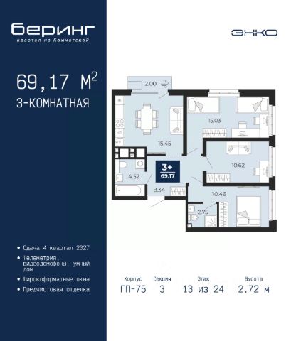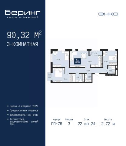 Успейте забронировать на этих условиях, период акции ограничен! Стоимость квартиры указана со скидкой, ваша экономия составит 537,860 руб. По всем вопросам обращайтесь в офис продаж, наши менеджеры вам все расскажут. Трехкомнатная квартира от застройщика с предчистовой отделкой в ЖК "Беринг" на 4 этаже. Общая площадь: 89.29 кв.м. Высота потолков 2.75 м. Дом монолитный, многоподъездный, переменной этажности, от 9 до 21 этажей. Квартира находится в 74.1-й секции высотой 21 этаж в корпусе ГП-74. На этаже 5 квартир. В подъезде 1 грузовой лифт. Окончание строительства - 1 квартал 2026 года. Оформление сделки по договору долевого участия. Подобно знаменитому исследователю, мы чувствуем себя первооткрывателями этой локации. Хотим показать новую суть места, сформировать для вас жизненный опыт, которого ещё не было. Беринг — район зелёного цвета. Беринг — район, который откроется вам с другой стороны. Впечатлит новым уровнем комфорта и качеством жизни. Беринг — открытие на карте города. Первый квартал расположен в районе Тура, в границах улиц: Камчатская Западносибирская Энтузиастов. Вокруг уже есть всё для того, чтобы ежедневная рутина была лишь частью жизни и не доставляла дискомфорта. Школы и детские сады, магазины и аптеки, поликлиника, места для семейного отдыха, пеших и велопрогулок, и даже рыбалки. Масштабное озеленение дворов — визитная карточка ЭНКО и ваш оазис спокойствия, чтобы отвлечься от повседневности. Раскидистые деревья, кустарники, травы и цветы — осталось остановиться, вдохнуть и расслабиться, глядя на эту природную красоту. Стилистика подъездов продолжает концепцию Беринга, вдохновлённого Камчаткой: сдержанный, но при этом впечатляющий дизайн соседствует с удобством и функциональностью. #26EIvU