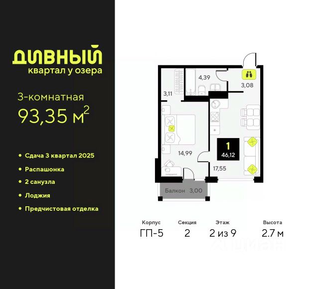 Трехкомнатная квартира с предчистовой отделкой в ЖК "Дивный квартал у озера" на 2 этаже. Общая площадь: 93.63 кв.м., жилая: 53.48 кв.м., площадь просторной кухни-столовой: 20.31 кв.м. Квартира - распашонка, без проходных комнат, окна выходят на paзные стороны дома. В квартире один балкон, один раздельный санузел. Высота потолков 2.7 м. Квартира будет сдаваться с предчистовой отделкой White Box: выровнены и оштукатурены стены, проведено электричество и отопление, установлены радиаторы. Вы также можете приобрести квартиру с ремонтом от застройщика, представленным в трех цветовых решениях Scandi, Wood и Coffee и включающим: ламинат, обои под покраску, двери, натяжной потолок, санузел с сантехникой. При желании вы можете заказать отделку под ключ, варианты возможных решений представлены в альбоме фотографий. Дом монолитный, трехподъездный, переменной этажности, от 9 до 17 этажей. Квартира находится в 3-й секции высотой 9 этажей в корпусе ГП-6. На этаже 5 квартир. В подъезде 1 пассажирский и 1 грузовой лифт. Окончание строительства - 4 квартал 2025 года. Оформление сделки по договору долевого участия. "Дивный квартал у озера" современный жилой квартал, удобно расположенный в 10-ти минутах от центра Тюмени, в уютном районе рядом с зеленым массивом и озером Алебашево. Комплекс находится между улицами Мельникайте и Алебашевская, что обеспечивает его хорошую транспортную доступность до центра на автомобиле всего 10 минут. Рядом с комплексом расположен Лесопарк имени Гагарина, экзотический Парк дружбы между Россией и Республикой Корея. "Дивный квартал у озера" объединяет архитектуру современной городской застройки и природную эстетику. Уютные дворы жилого комплекса будут не только безопасными, но и тихими. Закрытая территория надёжно защищена от шума и посторонних глаз. Здесь будут места для отдыха, детские площадки, зоны для выгула собак. В холлах первого этажа расположены мягкая зона ожидания, общественные санузлы и просторная колясочная. Квартал будет располагать богатой инфраструктурой: на первых этажах домов разместятся магазины, пекарни, кофейни, пункты выдачи, аптеки, детские центры, цветочные салоны и многое другое, что сделает жизнь поистине комфортной. В комплексе есть теплый подземный паркинг и кладовые. #zWAC28