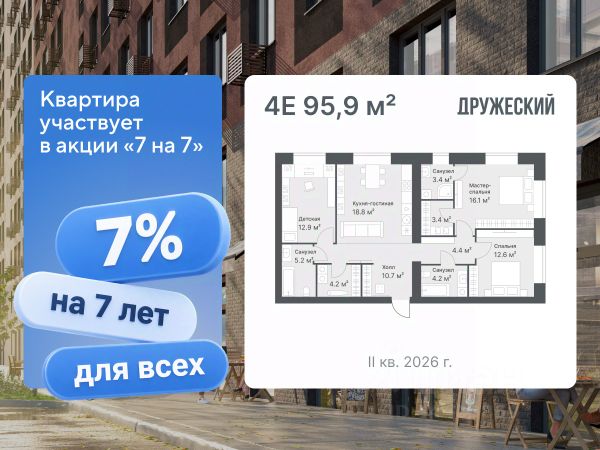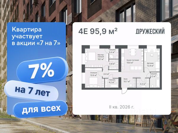 Условия покупки для этой квартиры: Cтавка 7% для всех. Срок ставки 7 лет. Ежемесячный платеж 65 921 руб. в месяц. Первоначальный взнос 20% или 2 478 661 руб Еврочетырехкомнатная квартира площадью 95,9 м² Просторная квартира в европейской планировке. Окна выходят на две стороны. Одно из окон в санузле мастер-спальни, чтобы обеспечить естественный свет и возможность проветривать помещение. В квартире предчистовая отделка: стены оштукатурены и выровнены по общему уровню, на полу слой цементно-песчаного раствора с дополнительным гидроизоляционным слоем в ванной. Проведена электрика и готовы розетки с выключателями. А ещё установлены сейф-двери и счётчики с телеметрией. Квартал "Дружеский" расположен на улице Кремлёвской рядом с Московским трактом. Сдача в 2026 году. Здесь два дома разной этажности — они объединены приватным двором без машин. Вместо них зоны отдыха и детские площадки из натуральных материалов. Чтобы было безопасно, по периметру домов работает видеонаблюдение. Рядом развитая инфраструктура: супермаркеты с пунктами выдачи, новая школа и торговый центр "Колумб". Для жителей дома работает приложение. Там можно оплатить счета, написать управляющей компании и позвать мастера на дом. За него не нужно платить или оформлять подписки — просто установить и зарегистрироваться. С этим поможет управляющая при получении ключей. ЖК построил ПСК Дом девелопмент — застройщик с фокусом на развитие Тюмени с 26-летним опытом на рынке недвижимости. Способы покупки: — ипотечные программы — обмен вашего жилья на новую квартиру — дистанционная покупка — рассрочка Узнать дополнительную информацию и записаться на встречу в офисе продаж можно по номеру, указанному в объявлении.