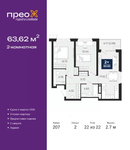 Спешите оформить бронирование по акционной цене! Предложение ограничено! Стоимость квартиры указана со скидкой, ваша экономия составит 462,803 RUB. По всем вопросам звоните в офис продаж, мы вам все подробно расскажем! 2-комн. квартира с предчистовой отделкой в ЖК "Прео" на 9 этаже. Общая площадь: 64.38 кв.м., жилая: 29.31 кв.м., площадь просторной кухни-столовой: 16.28 кв.м. Квартира - распашонка, без проходных комнат, окна выходят на paзные стороны дома. В квартире одна лоджия, один совмещенный и один раздельный санузел. Высота потолков 2.7 м. Дом монолитный, трехподъездный, переменной этажности, от 14 до 23 этажей. Квартира находится в 3-й секции высотой 14 этажей в корпусе 206. На этаже 6 квартир. В подъезде 1 пассажирский и 1 грузовой лифт. Окончание строительства - 1 квартал 2026 года. Оформление сделки по договору долевого участия. Преображенский — один из самых привлекательных районов для жизни! Это полностью самостоятельный жилой район с точки зрения инфраструктуры. Преображенский находится между Московским и Червишевским трактами в квартале улиц Закалужская — Вьюжная — Александра Протозанова. Не нужно ждать, когда появится инфраструктура — переезжайте на всё готовое. Вблизи расположены действующие школа и детский сад. В этом году откроется еще один сад, а в следующем году — школа. По соседству с Преображенским запланировано строительство городского парка "Комарово" площадью 38 гектар. За 10 минут можно доехать на автомобиле до крупных ТРЦ: "Лента", "Кристалл", "Леруа Мерлен", "Метро" и "Ашан". С 2018 года в районе открыт Соседский центр — пространство, созданное для формирования добрососедской среды, совместного досуга, общения и реализации соседских инициатив. Здесь проходят встречи соседей, а также сами жители района организовывают мероприятия. Организатором такого события может стать любой желающий. В квартирах выполнена качественная предчистовая отделка. Гладкие стены с финишным выравниванием по маякам. Ровный потолок для установки натяжного потолка. Установлены пятикамерные окна с двойным стеклопакетом (3 стекла). Дизайнерские холлы с видеонаблюдением, безбарьерным и прозрачным входом всегда светло и спокойно. На первом этаже есть просторные колясочные, где все жители могут оставлять свои коляски и велосипеды. В Преображенском есть всё, что нужно для активного отдыха и занятий спортом. Мы сделали большое футбольное поле с безопасным покрытием. Также установили хоккейный корт, который оборудован по всем необходимым стандартам. Во дворах можно делать упражнения на специальных площадках с турниками. Весь район мы обустроили велодорожками, которые связаны в единый маршрут. У нас есть сухие фонтаны, бьющие из земли, деревья, веревки, сетки, скалодром, газон, песок и резинка — осталось просто дать своему ребенку право на свободную игру. По-настоящему хорошие дворы — это те, которые дети предпочитают соцсетям и телевизору. Аккредитация в банках: ПАО "Банк Уралсиб", ОАО "Альфа-Банк", "Сбербанк России", ПА
