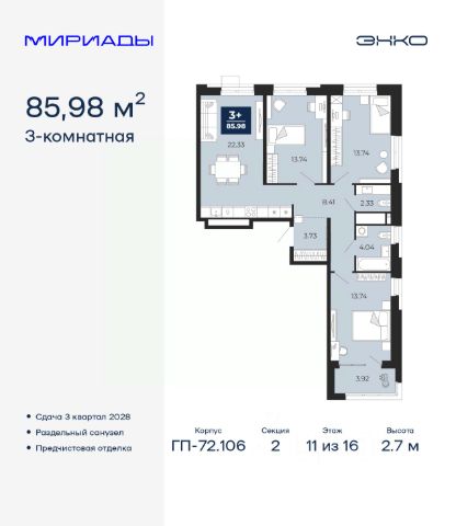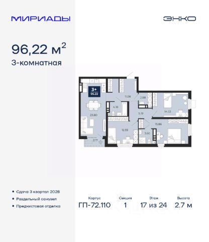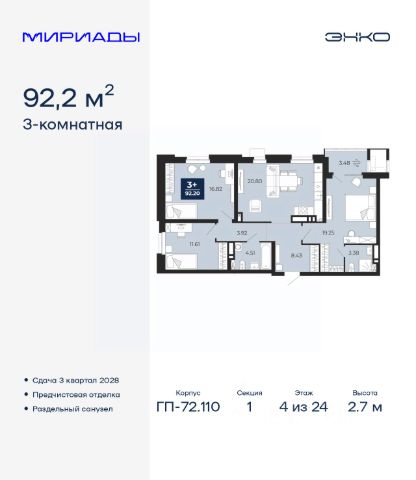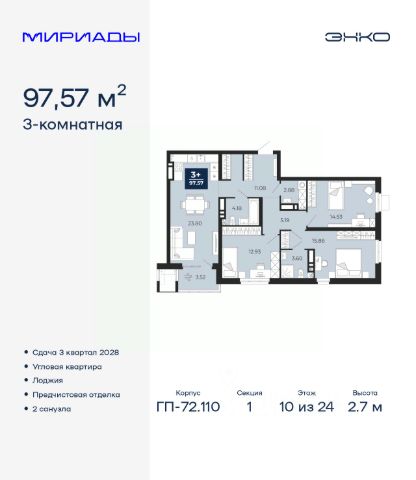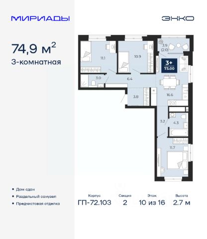 Продается трехкомнатная квартира с предчистовой отделкой в ЖК "Мириады" на 2 этаже. Общая площадь: 76.46 кв.м., жилая: 31.31 кв.м., площадь просторной кухни-столовой: 24.59 кв.м. Квартира угловая, идеально подойдет любителям тишины и панорамных видов. В квартире одна лоджия, один совмещенный и один раздельный санузел. Высота потолков 2.7 м. Дом монолитный, черырехподъездный, переменной этажности, от 13 до 16 этажей. Квартира находится в 4-й секции высотой 16 этажей в корпусе ГП-72.106. На этаже 6 квартир. В подъезде 1 пассажирский и 1 грузовой лифт. Окончание строительства - 3 квартал 2028 года. Оформление сделки по договору долевого участия. Вселенная бесконечных историй. Ранее невиданный Тюмени масштаб: территория 240 гектаров и 1 650 000 м² застройки. Мириады это город масштабных перемен и больших возможностей. Город зеленых рощ и зеркальных озер. Город для работы, учебы и развлечений. Город для детей и их родителей. Город для всех и каждого. Проект расположен в районе Мыс рядом с ТРЦ "Тюмень Сити Молл" в границах улицы Тимофея Чаркова, Тобольского тракта и объездной дороги. Срок полного освоения территории - до 2034 года. #2MDAwC