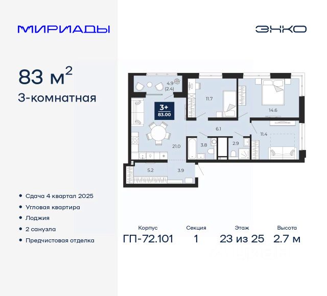 Трехкомнатная квартира с предчистовой отделкой в ЖК "Мириады" на 12 этаже. Общая площадь: 94.2 кв.м., жилая: 34.1 кв.м., площадь просторной кухни-столовой: 18.8 кв.м. Квартира угловая, окна oбecпeчивaют paвнoмepнoe ocвeщeниe в тeчeниe дня. В квартире один балкон, два совмещенных санузла. Высота потолков 2.7 м. Дом монолитный, двухподъездный, переменной этажности, от 14 до 18 этажей. Квартира находится во 2-й секции высотой 14 этажей в корпусе ГП-72.104. На этаже 8 квартир. В подъезде 1 пассажирский и 1 грузовой лифт. Окончание строительства - 4 квартал 2025 года. Оформление сделки по договору долевого участия. Вселенная бесконечных историй. Ранее невиданный Тюмени масштаб: территория 240 гектаров и 1 650 000 м² застройки. Мириады это город масштабных перемен и больших возможностей. Город зеленых рощ и зеркальных озер. Город для работы, учебы и развлечений. Город для детей и их родителей. Город для всех и каждого. Проект расположен в районе Мыс рядом с ТРЦ "Тюмень Сити Молл" в границах улицы Тимофея Чаркова, Тобольского тракта и объездной дороги. Срок полного освоения территории - до 2034 года. #Z6vEDZ