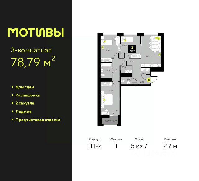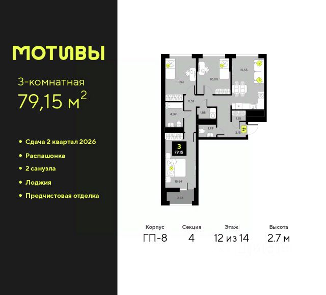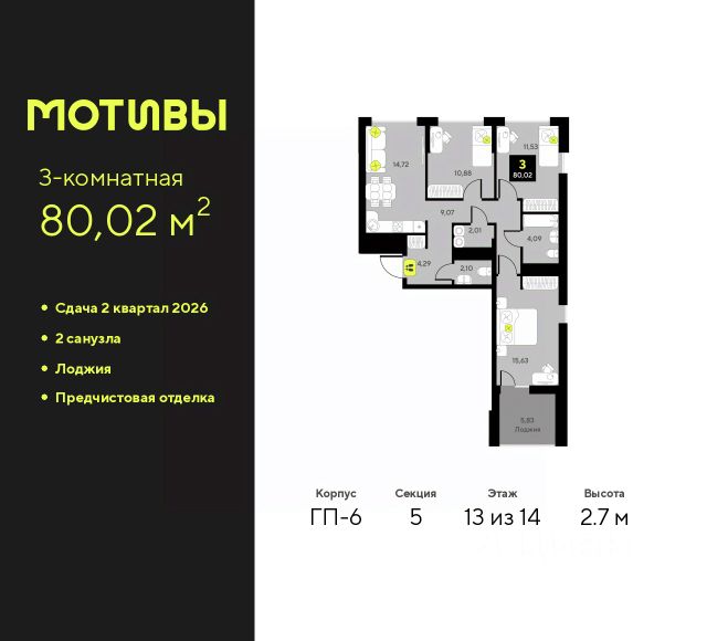 Продается 3-комн. квартира от застройщика с предчистовой отделкой в ЖК "Мотивы" на 12 этаже. Общая площадь: 80.03 кв.м., жилая: 37.95 кв.м., площадь просторной кухни-столовой: 14.72 кв.м. Квартира - распашонка, без проходных комнат, окна выходят на paзные стороны дома. В квартире одна лоджия, один совмещенный и один раздельный санузел. Высота потолков 2.7 м. Квартира будет сдаваться с предчистовой отделкой White Box: выровнены и оштукатурены стены, проведено электричество и отопление, установлены радиаторы. Вы также можете приобрести квартиру с ремонтом от застройщика, представленным в трех цветовых решениях Scandi, Wood и Coffee и включающим ламинат, обои под покраску, двери, натяжной потолок и санузел с сантехникой. При желании вы можете заказать отделку под ключ, варианты возможных решений представлены в альбоме фотографий. Дом монолитный, черырехподъездный, переменной этажности, от 12 до 14 этажей. Квартира находится в 5-й секции высотой 14 этажей в корпусе ГП-6. На этаже 5 квартир. В подъезде 1 пассажирский и 1 грузовой лифт. Окончание строительства - 2 квартал 2026 года. Оформление сделки по договору долевого участия. Закрытая от автомобилей территория, безопасный двор и камеры видеонаблюдения - гаранты вашего спокойствия. Квартал будет располагать богатой инфраструктурой: на первых этажах разместятся магазины, пекарни, кофейни, пункты выдачи, аптеки, детские центры, цветочные салоны и многое другое, что сделает жизнь поистине комфортной. Рядом находится парк общей площадью почти 5000 м², в котором располагаются локации для игр и отдыха жителей, здесь можно совершить утреннюю пробежку или прогуляться после рабочего дня. В парке есть зона воркаута с тренажерами для взрослых, игровые комплексы с горками и канатный комплекс для детей разных возрастов, качели и лавочки для отдыха, площадки для командных видов спорта и для панна-футбола. В ЖК "Мотивы" всё продумано до мелочей: светлые холлы входных групп, оформленные в едином стиле, просторные колясочные, лапомойки для питомцев. На территории комплекса находятся 2 8-ми этажных паркинга и более 1000 м/м на открытой парковке. Жилой комплекс находится в одном из экологически благоприятных районов Тюмени, недалеко от Плехановского бора. При этом до центра города можно добраться за 15 минут, а до международного аэропорта Рощино за 13 минут. Окончание строительства: ГП 1, 2, 3, 4 сдача до конца 2024 года, ГП 6, 7, 8 сдача 2 квартал 2026 года. #ZwaBWW