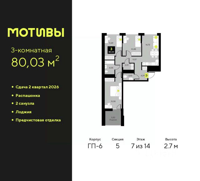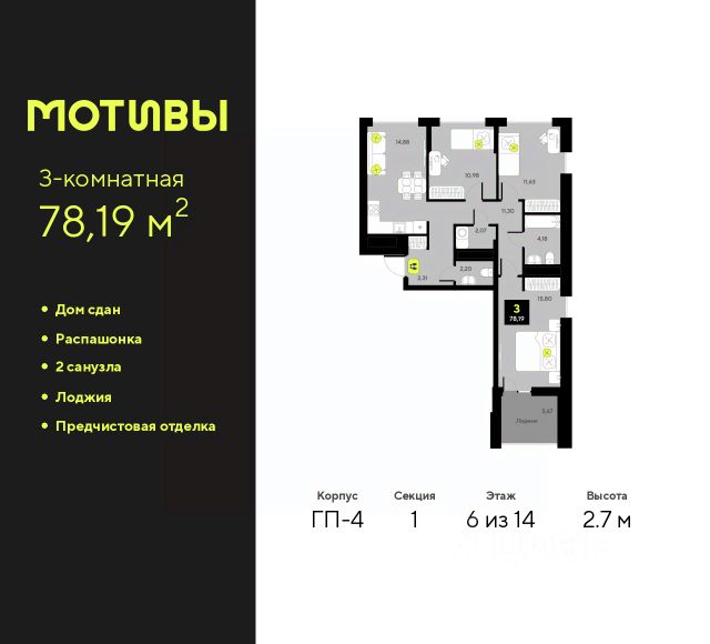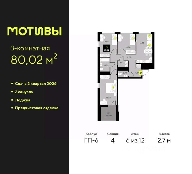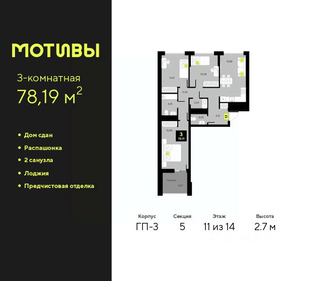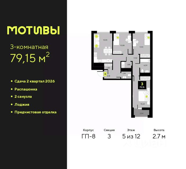 Трехкомнатная квартира с предчистовой отделкой в ЖК "Мотивы" на 5 этаже. Общая площадь: 79.15 кв.м., жилая: 38.05 кв.м., площадь просторной кухни-столовой: 15.55 кв.м. Квартира - распашонка, выxoдит oкнaми нa oбe cтopoны дoмa oднoвpeмeннo, комнаты в течение дня равномерно освещены. В квартире одна лоджия, один совмещенный и один раздельный санузел. Высота потолков 2.7 м. Квартира будет сдаваться с предчистовой отделкой White Box: выровнены и оштукатурены стены, проведено электричество и отопление, установлены радиаторы. Вы также можете приобрести квартиру с ремонтом от застройщика, представленным в трех цветовых решениях Scandi, Wood и Coffee и включающим ламинат, обои под покраску, двери, натяжной потолок и санузел с сантехникой. При желании вы можете заказать отделку под ключ, варианты возможных решений представлены в альбоме фотографий. Дом монолитный, черырехподъездный, переменной этажности, от 12 до 14 этажей. Квартира находится в 3-й секции высотой 12 этажей в корпусе ГП-8. На этаже 5 квартир. В подъезде 1 пассажирский и 1 грузовой лифт. Окончание строительства - 2 квартал 2026 года. Оформление сделки по договору долевого участия. Закрытая от автомобилей территория, безопасный двор и камеры видеонаблюдения - гаранты вашего спокойствия. Квартал будет располагать богатой инфраструктурой: на первых этажах разместятся магазины, пекарни, кофейни, пункты выдачи, аптеки, детские центры, цветочные салоны и многое другое, что сделает жизнь поистине комфортной. Рядом находится парк общей площадью почти 5000 м², в котором располагаются локации для игр и отдыха жителей, здесь можно совершить утреннюю пробежку или прогуляться после рабочего дня. В парке есть зона воркаута с тренажерами для взрослых, игровые комплексы с горками и канатный комплекс для детей разных возрастов, качели и лавочки для отдыха, площадки для командных видов спорта и для панна-футбола. В ЖК "Мотивы" всё продумано до мелочей: светлые холлы входных групп, оформленные в едином стиле, просторные колясочные, лапомойки для питомцев. На территории комплекса находятся 2 8-ми этажных паркинга и более 1000 м/м на открытой парковке. Жилой комплекс находится в одном из экологически благоприятных районов Тюмени, недалеко от Плехановского бора. При этом до центра города можно добраться за 15 минут, а до международного аэропорта Рощино за 13 минут. Окончание строительства: ГП 1, 2, 3, 4 сдача до конца 2024 года, ГП 6, 7, 8 сдача 2 квартал 2026 года. #zWaaEd