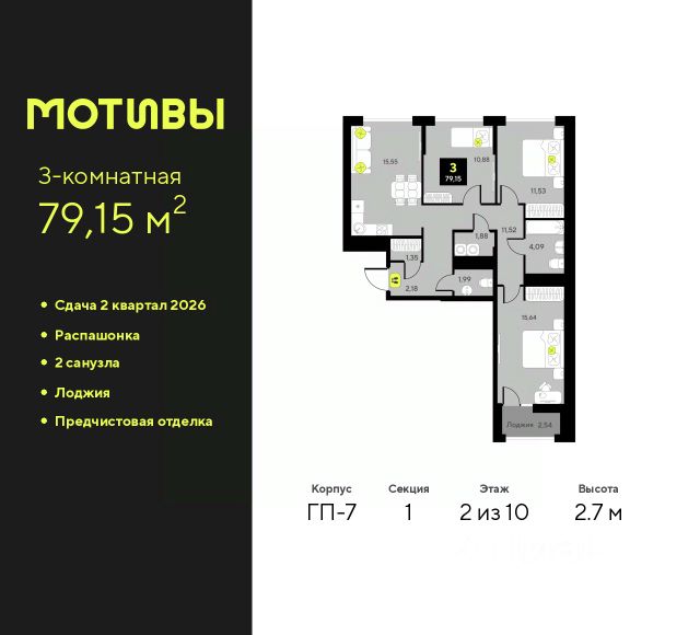 Трехкомнатная квартира от застройщика с предчистовой отделкой в ЖК "Мотивы" на 5 этаже. Общая площадь: 78.79 кв.м., жилая: 38.42 кв.м., площадь просторной кухни-столовой: 15.71 кв.м. Квартира - распашонка, без проходных комнат, окна выходят на paзные стороны дома. В квартире одна лоджия, один совмещенный и один раздельный санузел. Высота потолков 2.7 м. Квартира будет сдаваться с предчистовой отделкой White Box: выровнены и оштукатурены стены, проведено электричество и отопление, установлены радиаторы. Вы также можете приобрести квартиру с ремонтом от застройщика, представленным в трех цветовых решениях Scandi, Wood и Coffee и включающим ламинат, обои под покраску, двери, натяжной потолок и санузел с сантехникой. При желании вы можете заказать отделку под ключ, варианты возможных решений представлены в альбоме фотографий. Квартира находится в корпусе ГП-2. Дом монолитный, одноподъездный, высотой 7 этажей. На этаже 5 квартир. В подъезде 1 пассажирский и 1 грузовой лифт. Строительство окончено, дом сдан в 4 квартале 2024 года. Оформление сделки по договору купли-продажи. Закрытая от автомобилей территория, безопасный двор и камеры видеонаблюдения - гаранты вашего спокойствия. Квартал будет располагать богатой инфраструктурой: на первых этажах разместятся магазины, пекарни, кофейни, пункты выдачи, аптеки, детские центры, цветочные салоны и многое другое, что сделает жизнь поистине комфортной. Рядом находится парк общей площадью почти 5000 м², в котором располагаются локации для игр и отдыха жителей, здесь можно совершить утреннюю пробежку или прогуляться после рабочего дня. В парке есть зона воркаута с тренажерами для взрослых, игровые комплексы с горками и канатный комплекс для детей разных возрастов, качели и лавочки для отдыха, площадки для командных видов спорта и для панна-футбола. В ЖК "Мотивы" всё продумано до мелочей: светлые холлы входных групп, оформленные в едином стиле, просторные колясочные, лапомойки для питомцев. На территории комплекса находятся 2 8-ми этажных паркинга и более 1000 м/м на открытой парковке. Жилой комплекс находится в одном из экологически благоприятных районов Тюмени, недалеко от Плехановского бора. При этом до центра города можно добраться за 15 минут, а до международного аэропорта Рощино за 13 минут. Окончание строительства: ГП 1, 2, 3, 4 сдача до конца 2024 года, ГП 6, 7, 8 сдача 2 квартал 2026 года. #2SOdAi