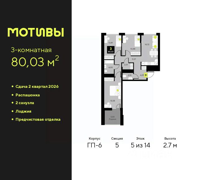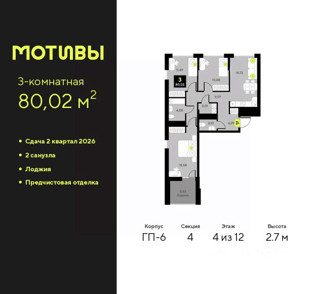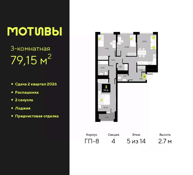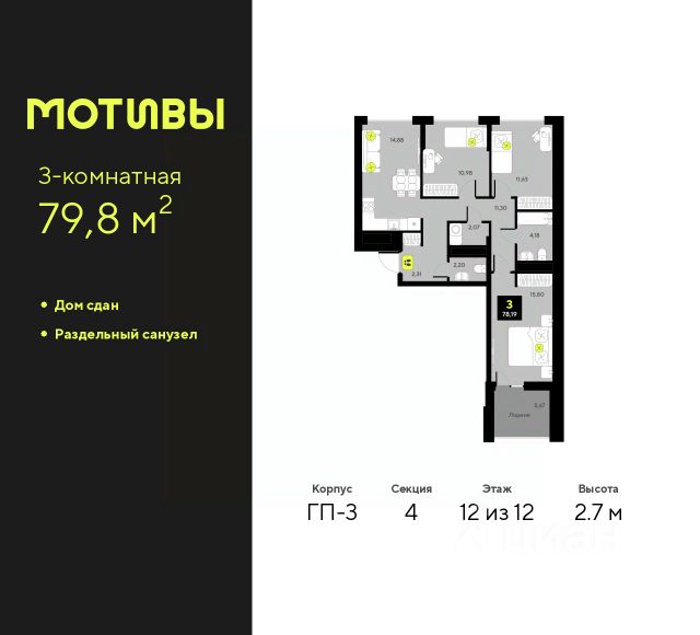 Просторная 3-комн. квартира с предчистовой отделкой в ЖК "Мотивы" на 5 этаже. Общая площадь: 79.8 кв.м. Высота потолков 2.7 м. Квартира будет сдаваться с предчистовой отделкой White Box: выровнены и оштукатурены стены, проведено электричество и отопление, установлены радиаторы. Вы также можете приобрести квартиру с ремонтом от застройщика, представленным в трех цветовых решениях Scandi, Wood и Coffee и включающим ламинат, обои под покраску, двери, натяжной потолок и санузел с сантехникой. При желании вы можете заказать отделку под ключ, варианты возможных решений представлены в альбоме фотографий. Дом монолитный, многоподъездный, переменной этажности, от 5 до 14 этажей. Квартира находится в 1-й секции высотой 14 этажей в корпусе ГП-4. На этаже 5 квартир. В подъезде 1 пассажирский и 1 грузовой лифт. На сегодняшний день строительство завершено, дом сдан в 4 квартале 2024 года. Оформление сделки по договору купли-продажи. Закрытая от автомобилей территория, безопасный двор и камеры видеонаблюдения - гаранты вашего спокойствия. Квартал будет располагать богатой инфраструктурой: на первых этажах разместятся магазины, пекарни, кофейни, пункты выдачи, аптеки, детские центры, цветочные салоны и многое другое, что сделает жизнь поистине комфортной. Рядом находится парк общей площадью почти 5000 м², в котором располагаются локации для игр и отдыха жителей, здесь можно совершить утреннюю пробежку или прогуляться после рабочего дня. В парке есть зона воркаута с тренажерами для взрослых, игровые комплексы с горками и канатный комплекс для детей разных возрастов, качели и лавочки для отдыха, площадки для командных видов спорта и для панна-футбола. В ЖК "Мотивы" всё продумано до мелочей: светлые холлы входных групп, оформленные в едином стиле, просторные колясочные, лапомойки для питомцев. На территории комплекса находятся 2 8-ми этажных паркинга и более 1000 м/м на открытой парковке. Жилой комплекс находится в одном из экологически благоприятных районов Тюмени, недалеко от Плехановского бора. При этом до центра города можно добраться за 15 минут, а до международного аэропорта Рощино за 13 минут. Окончание строительства: ГП 1, 2, 3, 4 сдача до конца 2024 года, ГП 6, 7, 8 сдача 2 квартал 2026 года.