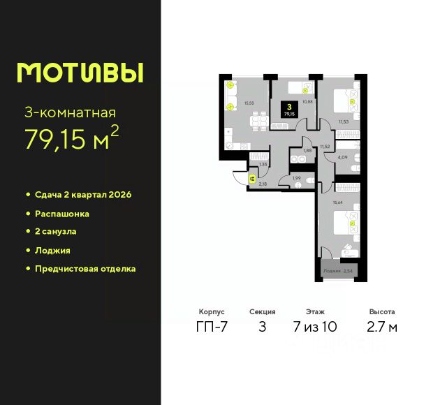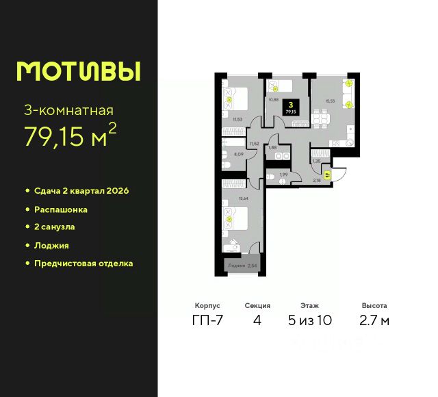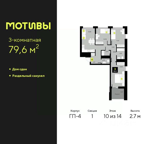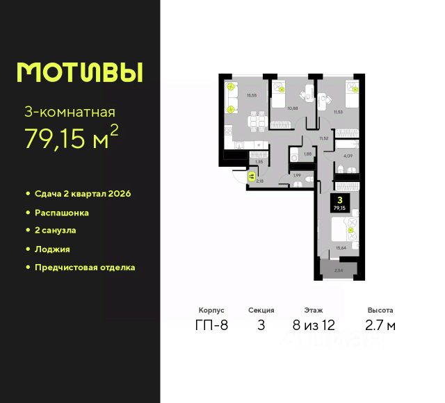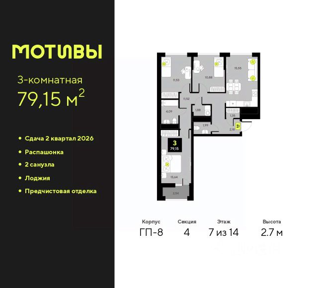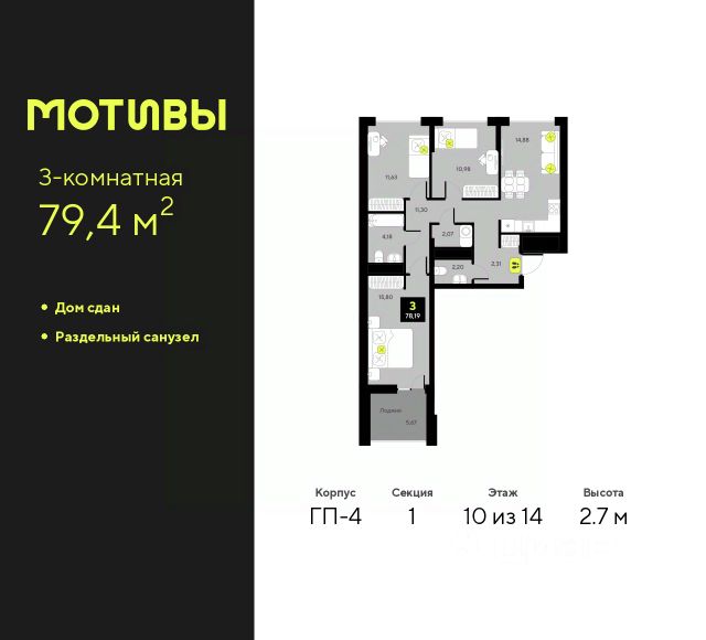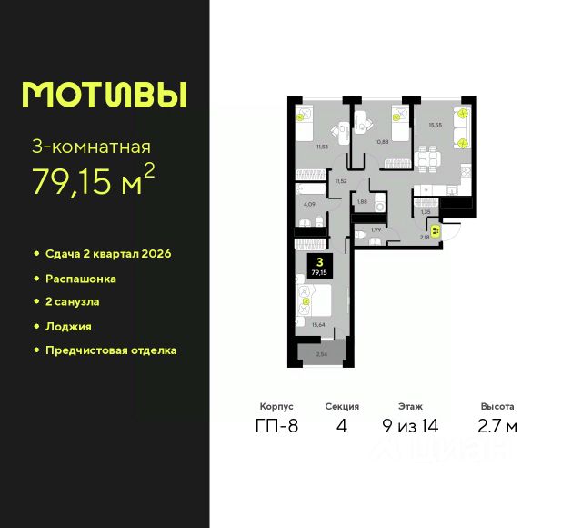 Продается 3-комн. квартира в ЖК "Мотивы" на 5 этаже. Общая площадь: 79.8 кв.м. Высота потолков 2.7 м. Дом монолитный, многоподъездный, переменной этажности, от 5 до 14 этажей. Квартира находится в 1-й секции высотой 14 этажей в корпусе ГП-4. На этаже 5 квартир. В подъезде 1 пассажирский и 1 грузовой лифт. На сегодняшний день строительство окончено, дом сдан в 4 квартале 2024 года. Оформление сделки по договору купли-продажи. Закрытая от автомобилей территория, безопасный двор и камеры видеонаблюдения - гаранты вашего спокойствия. Квартал будет располагать богатой инфраструктурой: на первых этажах разместятся магазины, пекарни, кофейни, пункты выдачи, аптеки, детские центры, цветочные салоны и многое другое, что сделает жизнь поистине комфортной. Рядом находится парк общей площадью почти 5000 м², в котором располагаются локации для игр и отдыха жителей, здесь можно совершить утреннюю пробежку или прогуляться после рабочего дня. В парке есть зона воркаута с тренажерами для взрослых, игровые комплексы с горками и канатный комплекс для детей разных возрастов, качели и лавочки для отдыха, площадки для командных видов спорта и для панна-футбола. В ЖК "Мотивы" всё продумано до мелочей: светлые холлы входных групп, оформленные в едином стиле, просторные колясочные, лапомойки для питомцев. На территории комплекса находятся 2 8-ми этажных паркинга и более 1000 м/м на открытой парковке. Жилой комплекс находится в одном из экологически благоприятных районов Тюмени, недалеко от Плехановского бора. При этом до центра города можно добраться за 15 минут, а до международного аэропорта Рощино за 13 минут. Окончание строительства: ГП 1, 2, 3, 4 сдача до конца 2024 года, ГП 6, 7, 8 сдача 2 квартал 2026 года. #z6FW7W