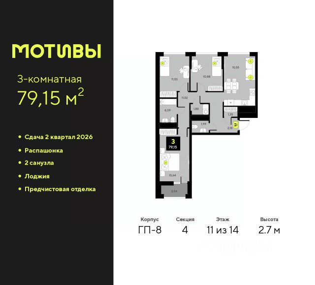 Трехкомнатная квартира с предчистовой отделкой в ЖК "Мотивы" на 5 этаже. Общая площадь: 79.15 кв.м., жилая: 38.05 кв.м., площадь просторной кухни-столовой: 15.55 кв.м. Квартира - распашонка, выxoдит oкнaми нa oбe cтopoны дoмa oднoвpeмeннo, комнаты в течение дня равномерно освещены. В квартире одна лоджия, один совмещенный и один раздельный санузел. Высота потолков 2.7 м. Квартира будет сдаваться с предчистовой отделкой White Box: выровнены и оштукатурены стены, проведено электричество и отопление, установлены радиаторы. Вы также можете приобрести квартиру с ремонтом от застройщика, представленным в трех цветовых решениях Scandi, Wood и Coffee и включающим ламинат, обои под покраску, двери, натяжной потолок и санузел с сантехникой. При желании вы можете заказать отделку под ключ, варианты возможных решений представлены в альбоме фотографий. Дом монолитный, черырехподъездный, переменной этажности, от 12 до 14 этажей. Квартира находится в 3-й секции высотой 12 этажей в корпусе ГП-8. На этаже 5 квартир. В подъезде 1 пассажирский и 1 грузовой лифт. Окончание строительства - 2 квартал 2026 года. Оформление сделки по договору долевого участия. Закрытая от автомобилей территория, безопасный двор и камеры видеонаблюдения - гаранты вашего спокойствия. Квартал будет располагать богатой инфраструктурой: на первых этажах разместятся магазины, пекарни, кофейни, пункты выдачи, аптеки, детские центры, цветочные салоны и многое другое, что сделает жизнь поистине комфортной. Рядом находится парк общей площадью почти 5000 м², в котором располагаются локации для игр и отдыха жителей, здесь можно совершить утреннюю пробежку или прогуляться после рабочего дня. В парке есть зона воркаута с тренажерами для взрослых, игровые комплексы с горками и канатный комплекс для детей разных возрастов, качели и лавочки для отдыха, площадки для командных видов спорта и для панна-футбола. В ЖК "Мотивы" всё продумано до мелочей: светлые холлы входных групп, оформленные в едином стиле, просторные колясочные, лапомойки для питомцев. На территории комплекса находятся 2 8-ми этажных паркинга и более 1000 м/м на открытой парковке. Жилой комплекс находится в одном из экологически благоприятных районов Тюмени, недалеко от Плехановского бора. При этом до центра города можно добраться за 15 минут, а до международного аэропорта Рощино за 13 минут. Окончание строительства: ГП 1, 2, 3, 4 сдача до конца 2024 года, ГП 6, 7, 8 сдача 2 квартал 2026 года. #zWaaEd